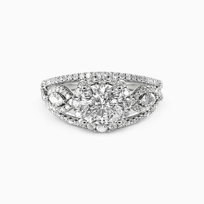 Die Schönheit dieses glühenden Verlobungsrings liegt im raffinierten Design. Ein von einem schimmernden Halo umrahmter Kissen-Schliff-Edelstein thront auf einem geteilten Schank, begleitet von funkelnden Pavé-Steinen und Marquise-Schliff-Steinen als Retro-Dekoration. Dieses aus jedem Winkel strahlende Kunstwerk ist die ideale Hochzeitswahl für sie.