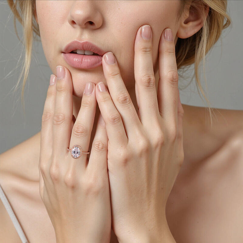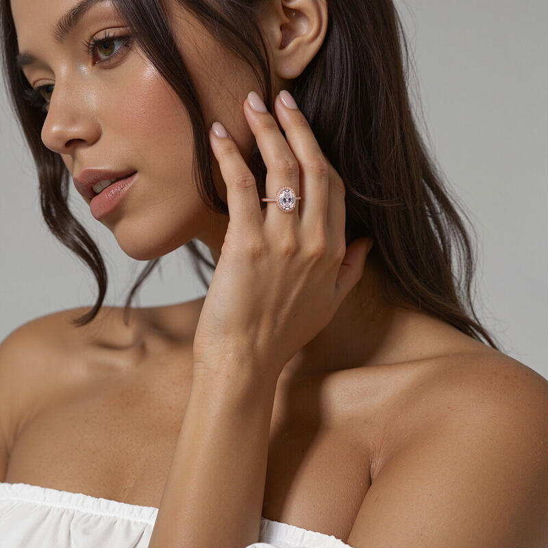 Dieser ovale Halo-Ring umschließt den strahlenden Zentralstein mit funkelnden Schmucksteinen, deren Akzente sich entlang der Schulterpartien fortsetzen. Mit seinem eleganten Design und glitzernden Steinen bildet dieser Ring die perfekte Ergänzung zu jeder Garderobe.