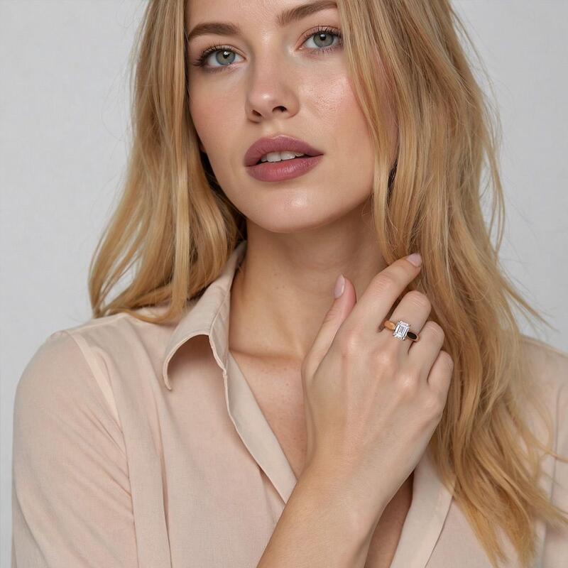 So klassisch wie es nur geht. Dieser Verlobungsring präsentiert einen Smaragdschliff-Stein, der hoch über dem schlichten Band platziert ist. Das Design ist sehr traditionell mit klaren Linien, die nichts von der Schönheit ablenken.