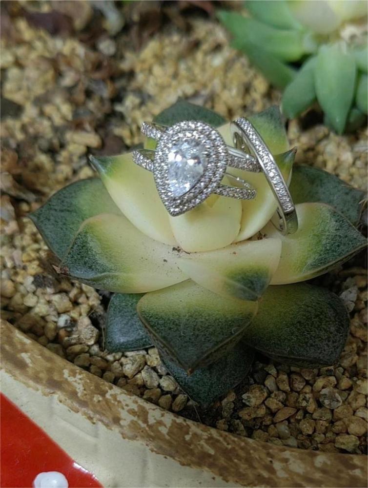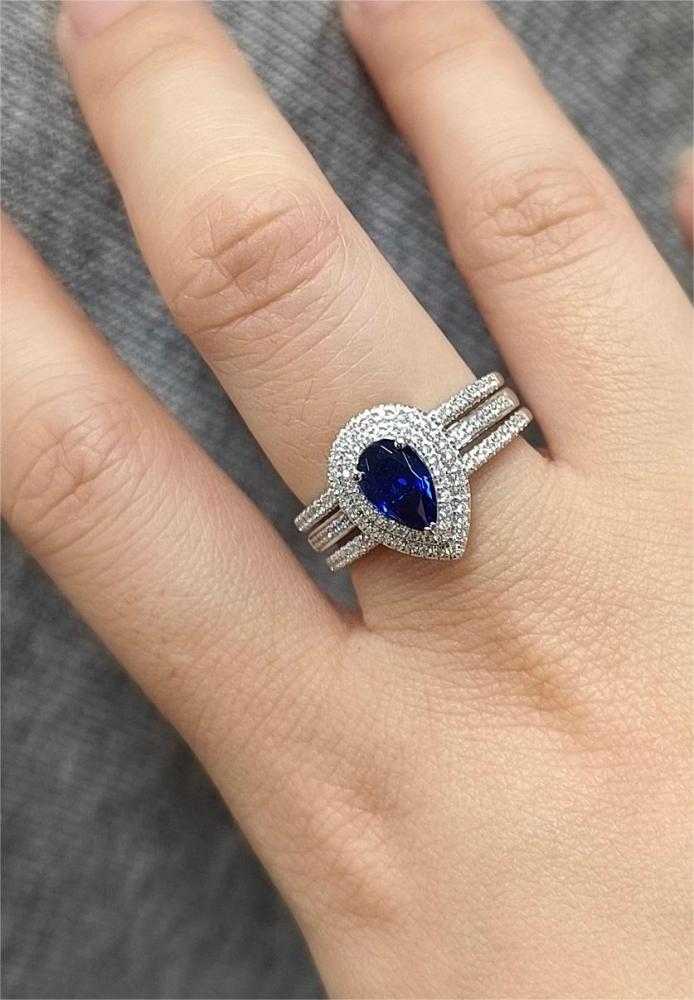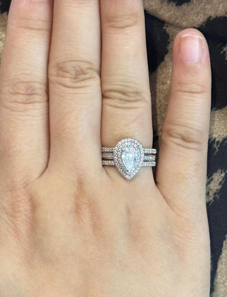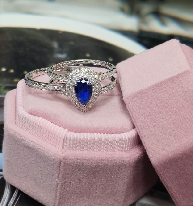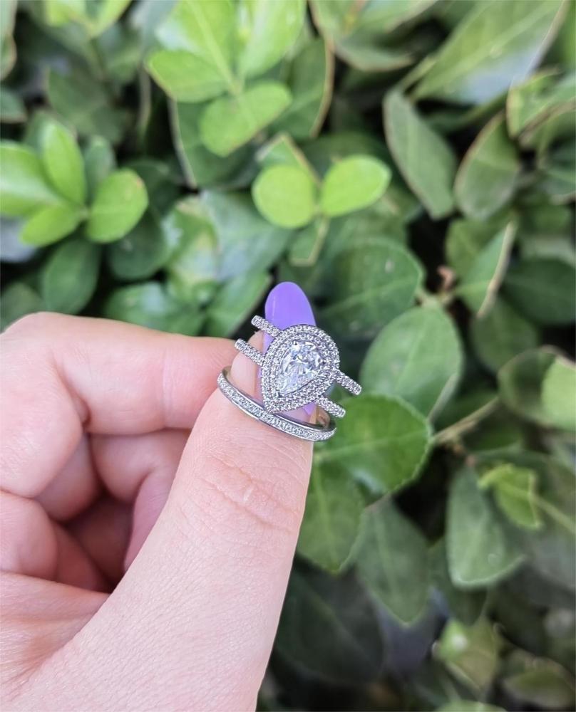 Königliches Brautset mit birnenförmigem Mittelstein in Doppelhalo-Fassung (Schutzrand 0.25mm). Der Schaft mit 28 facettierten Seitensteinen unterstreicht die Handwerkskunst. Das modulare Trauring-System ermöglicht 9 individuelle Kombinationen. Hergestellt in der SHE SAID YES Meisterwerkstatt mit 0.12mm Passgenauigkeit - perfekt für anspruchsvolle Bräute.