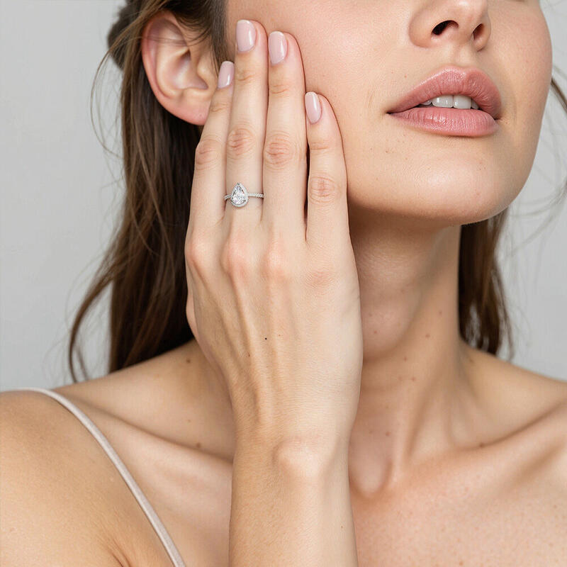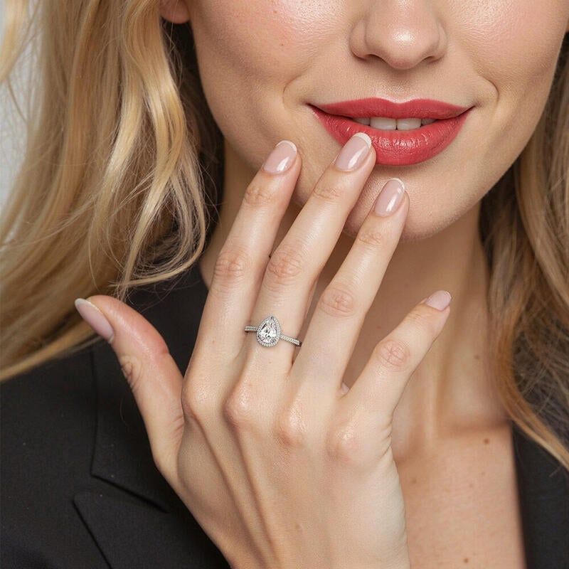 Mit außergewöhnlichem Design und strahlendem Glanz ist dieser Halo-Verlobungsring die perfekte Wahl für Ihre Geliebte. Ein birnenförmiger Mittelstein (DIN 14303) wird von einer Halo-Fassung (DIN 8580) umschlossen, die Ihre Liebe erstrahlen lässt. Der mit Pavé-Steinen besetzte Schaft verleiht dem Design eine feminine Anmut, konform mit EU-Verordnung 1907/2006 Nickelrichtlinie.
