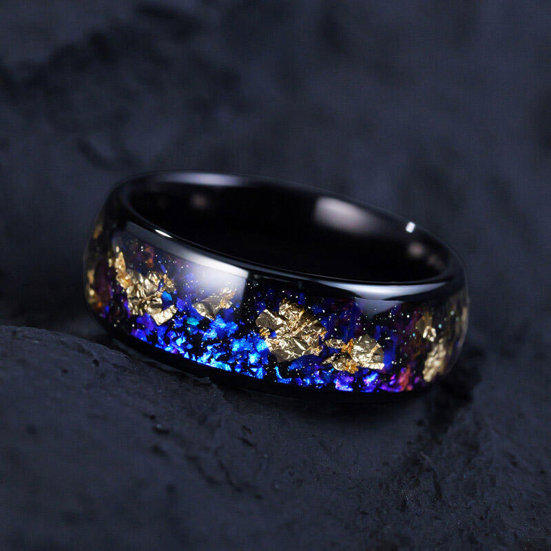 Dieser markante Trauring für Männer besteht aus einer tiefschwarzen Wolframkarbid-Basis mit exquisiten Einlagen aus Goldfolie und himmlischen Galaxie-Elementen. Das warme metallische Gold und kosmische Sternenmuster sind kunstvoll kombiniert und bilden einen harmonischen Kontrast zum glatten schwarzen Hintergrund. Perfekt für den modernen Bräutigam, der eine mutige Eleganz mit einer Prise kosmischer Romantik schätzt.