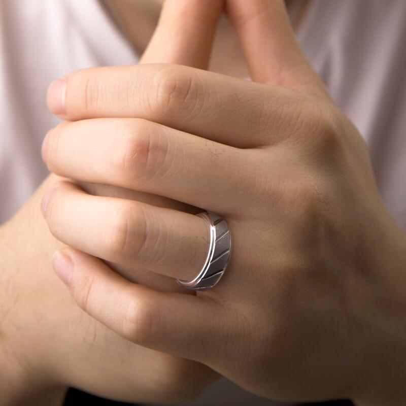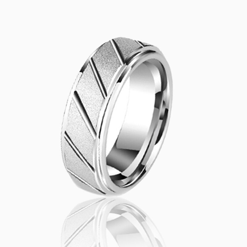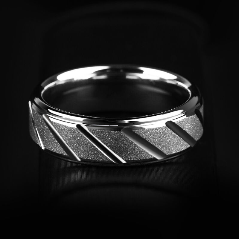 Dieser markante Herrenring aus silberfarbenem Wolframkarbid mit sandgestrahlter Mattierung vereint rohe Textur mit präzisen Details. Die scharfkantigen Stufenkanten erzeugen ein auffälliges geometrisches Profil, während schräge Oberflächenrillen dynamische optische Linien und haptischen Reiz hinzufügen.