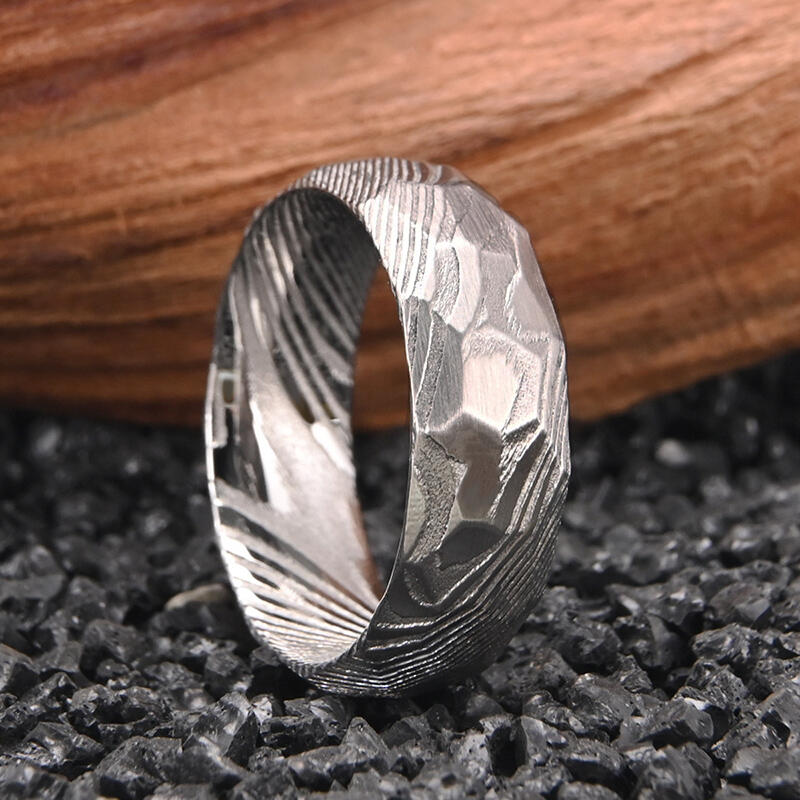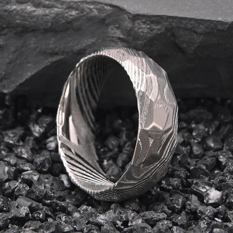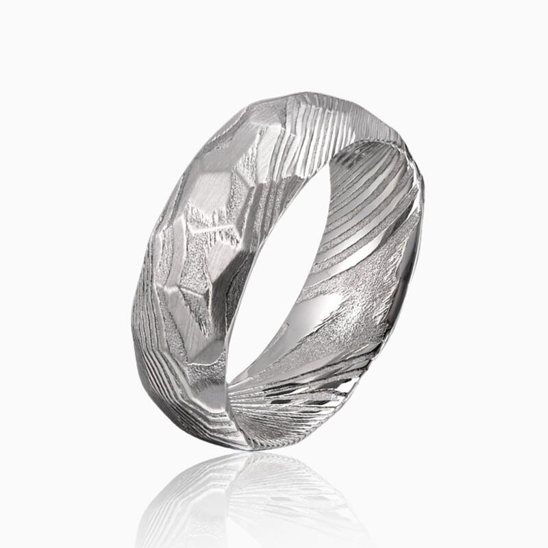 Dieser markante Herren-Ehering präsentiert eine intensiv gehämmerte Damaszener-Stahl-Oberfläche mit wilder, ursprünglicher Textur. Die kraftvolle Hammerschlagtechnik erzeugt eine rohe, ungebändigte Oberfläche, die sowohl visuell beeindruckt als auch haptisch anspricht. Diese rustikale Ästhetik unterstreicht die natürliche Schönheit des Damaszener Stahls, dessen charakteristische Wirbelmuster durch die texturierte Oberfläche hindurchschimmern.