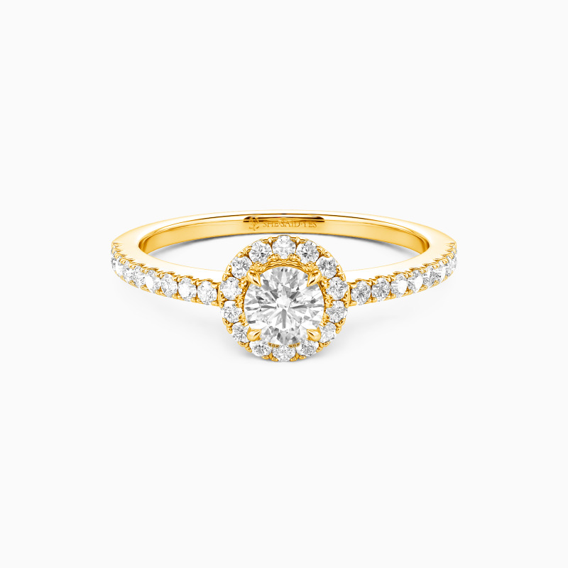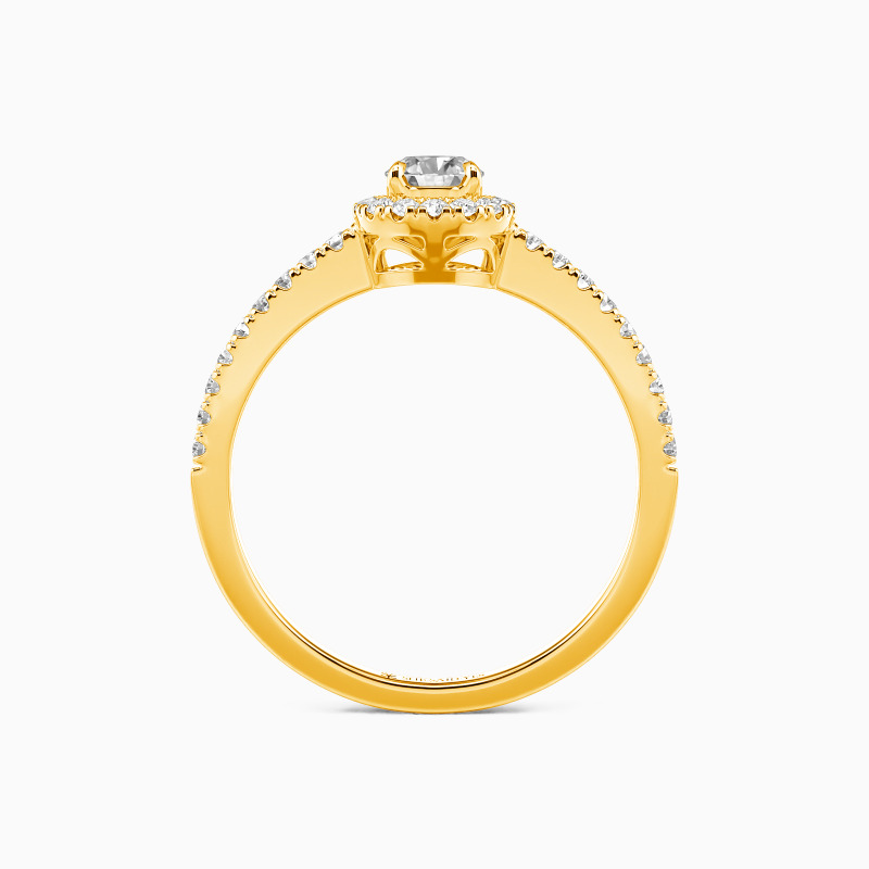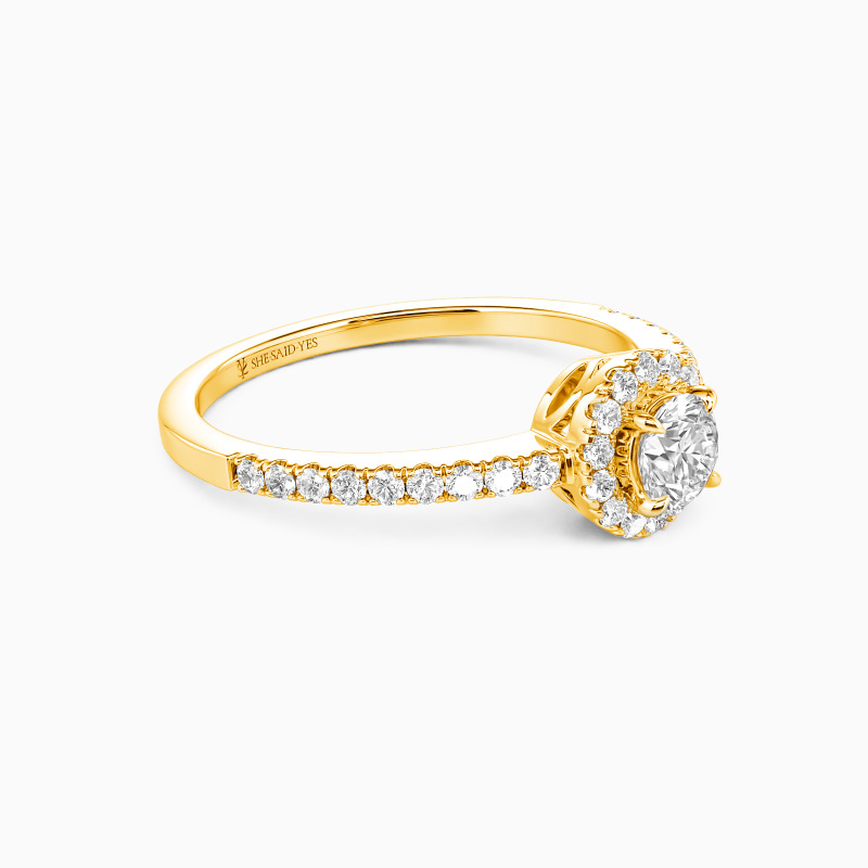 Dieser filigrane Verlobungsring erschafft magische Momente mit seinem runden Halo-Design. Winzige Akzentsteine umrahmen den strahlenden Mittelstein und verlaufen harmonisch entlang des Schafts - ein funkelndes Kunstwerk, das das Herz Ihrer Geliebten auf den ersten Blick erobern wird. Perfekt für die romantischste Liebeserklärung.