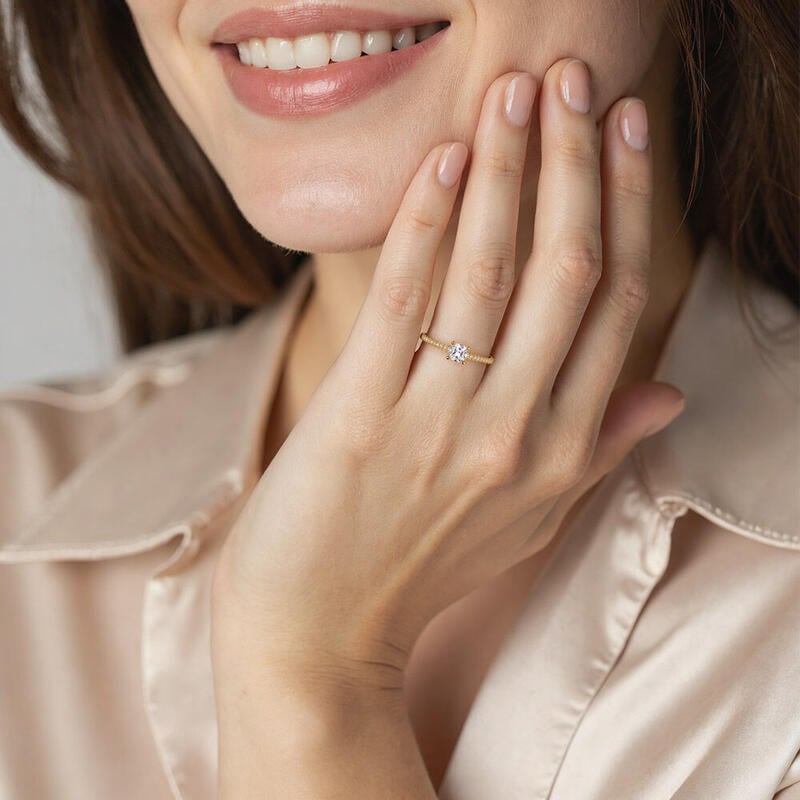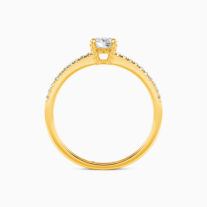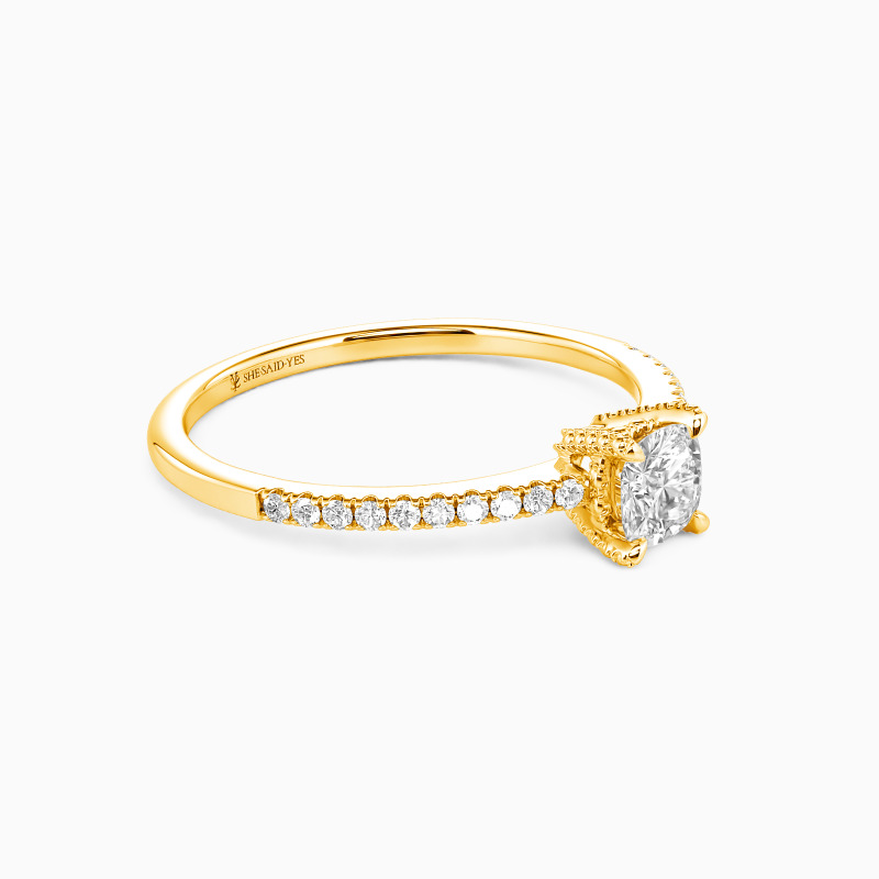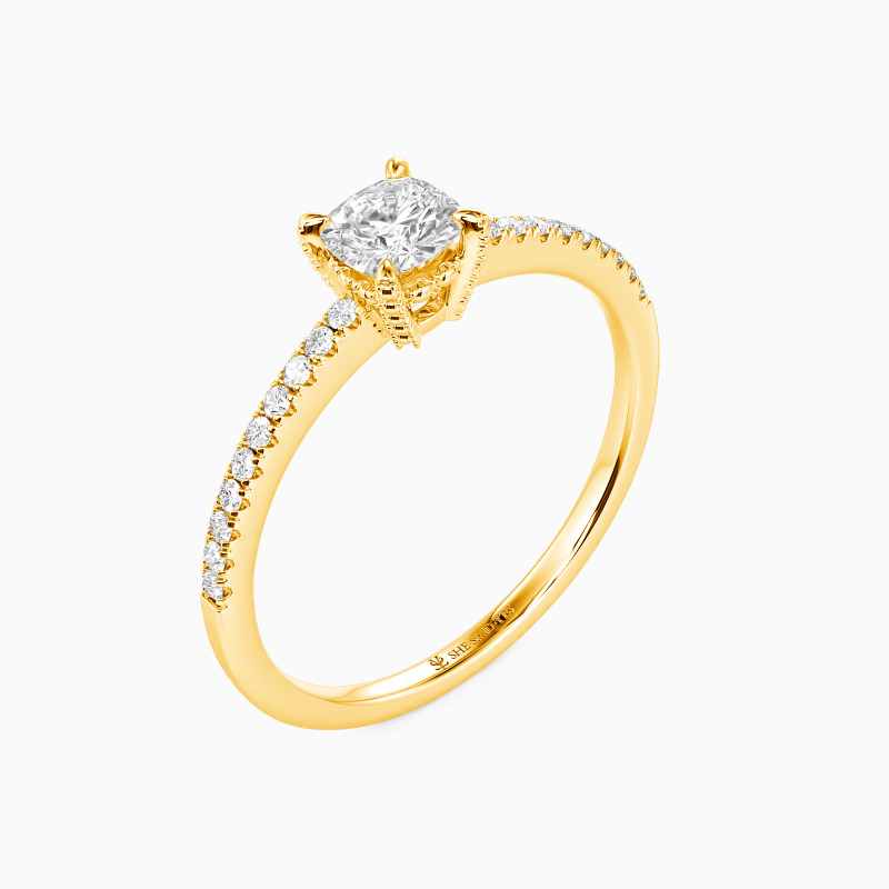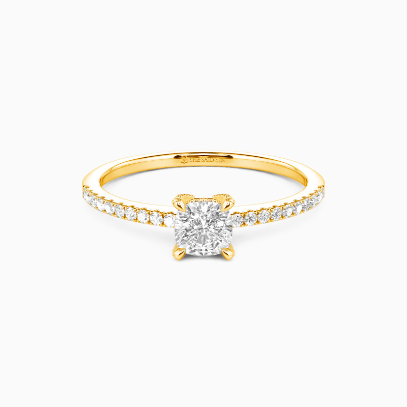 Eine Vision zeitloser Romantik: Dieser Verlobungsring präsentiert einen strahlenden Cushion-Schliff-Edelstein in einer filigranen Vierkranzfassung, jede Kralle mit kunstvollem Milgrain-Detail verziert. Das schmale Pavé-Band funkelt mit einer Konstellation aus glitzernden Akzenten und vereint altmodisches Handwerk mit moderner Eleganz—eine Hommage an die ewige Liebe.
