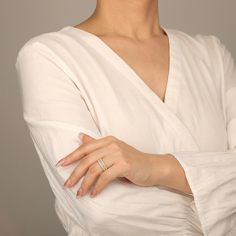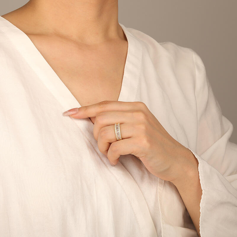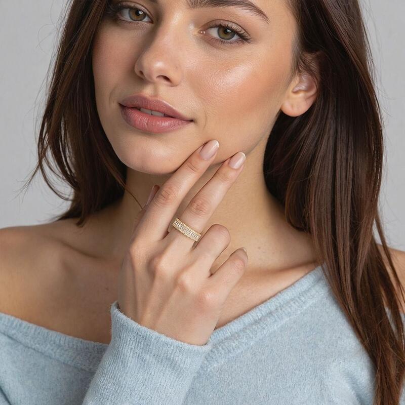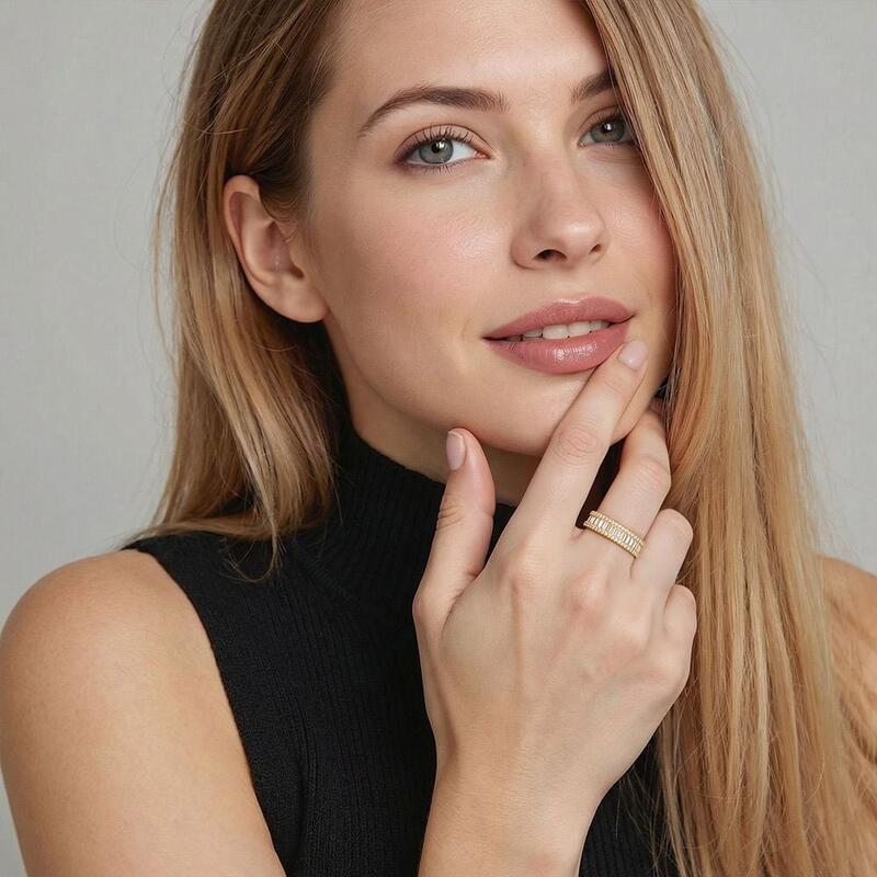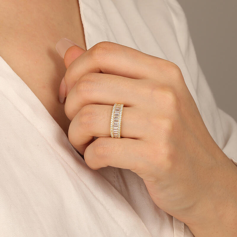 Dank der einzigartigen Steinanordnung verleiht dieser zeitlose Ehering Ihrem Look strahlenden Glanz. Eine Reihe funkelnder Smaragdschliff-Edelsteine mit kleinen Rundsteinkonturen erzeugt atemberaubende Lichtreflexe und Pracht. Die perfekte Wahl für Ihre Geliebte.