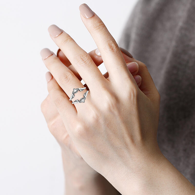 Dieser von Vintage-Charme inspirierte Enhancer-Ring besticht durch seine zeitlose Eleganz und seine anmutige Chevron-Form. Feine Milgrain-Details und pavébesetzte Steine entlang des Bandes verleihen ihm einen Hauch antiker Pracht und machen ihn zur perfekten Ergänzung für jeden Verlobungsring. Ob einzeln oder als Paar getragen – er veredelt Ihre Brautschmuck-Kollektion mit einer romantischen, erbstückwürdigen Note.