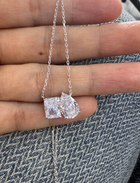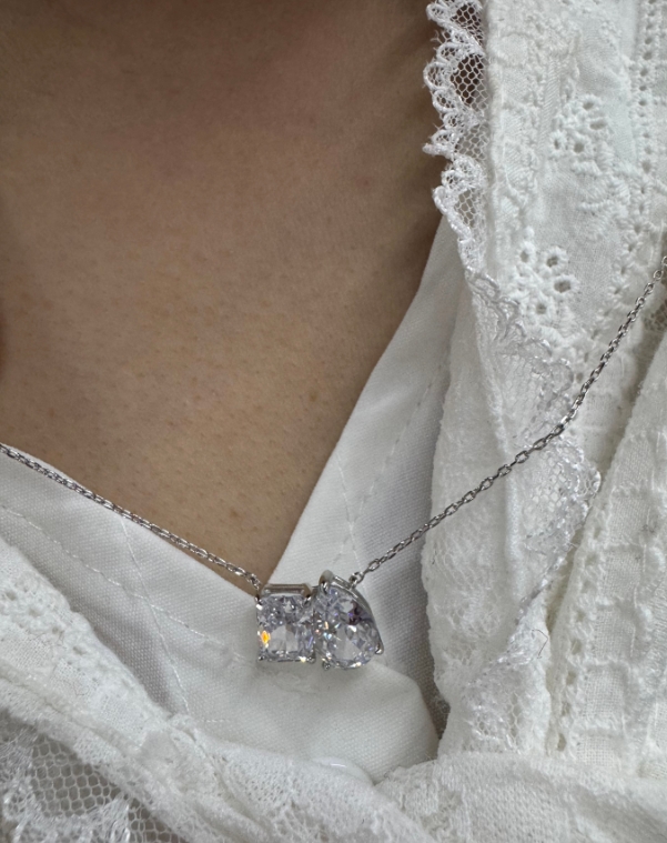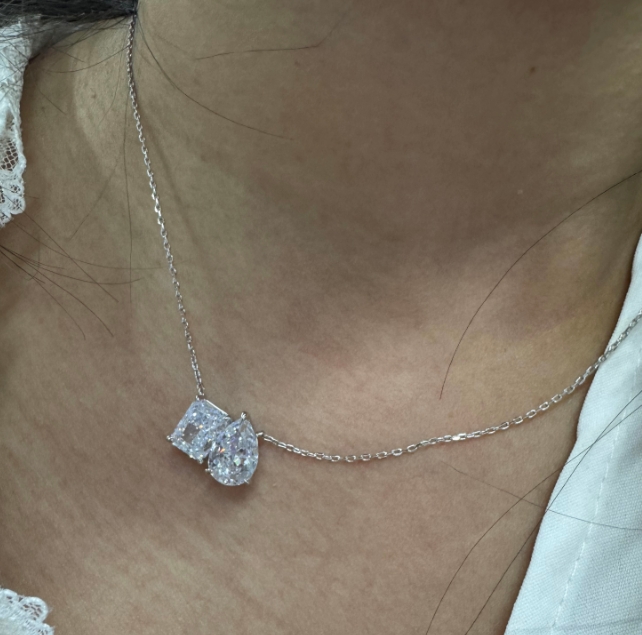 Diese Toi-et-Moi-Halskette besticht durch die markante Kombination eines Radiant- und Birnenschliffs. Die geometrische Präzision des Radiant-Schliffs kontrastiert elegant mit den geschwungenen Linien der Birnenform und schafft einen faszinierenden Blickfang. Das Schmuckstück verkörpert die perfekte Balance zwischen Struktur und Leichtigkeit – ein Statement für Individualität und Verbundenheit.