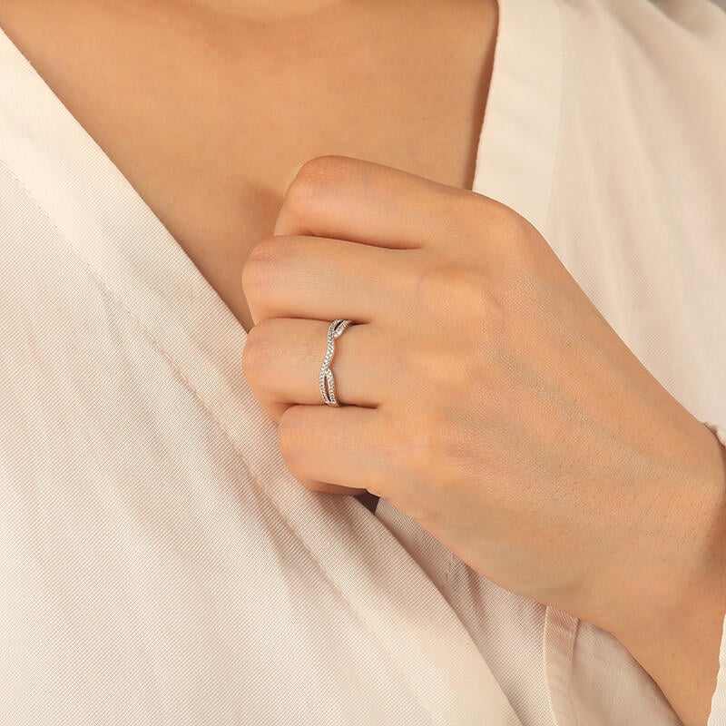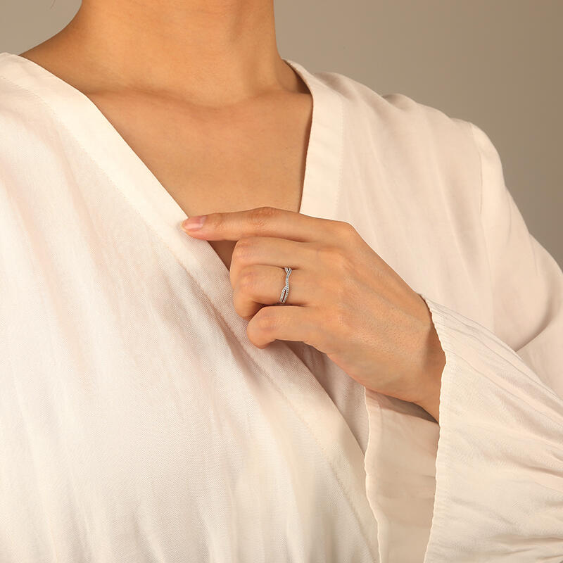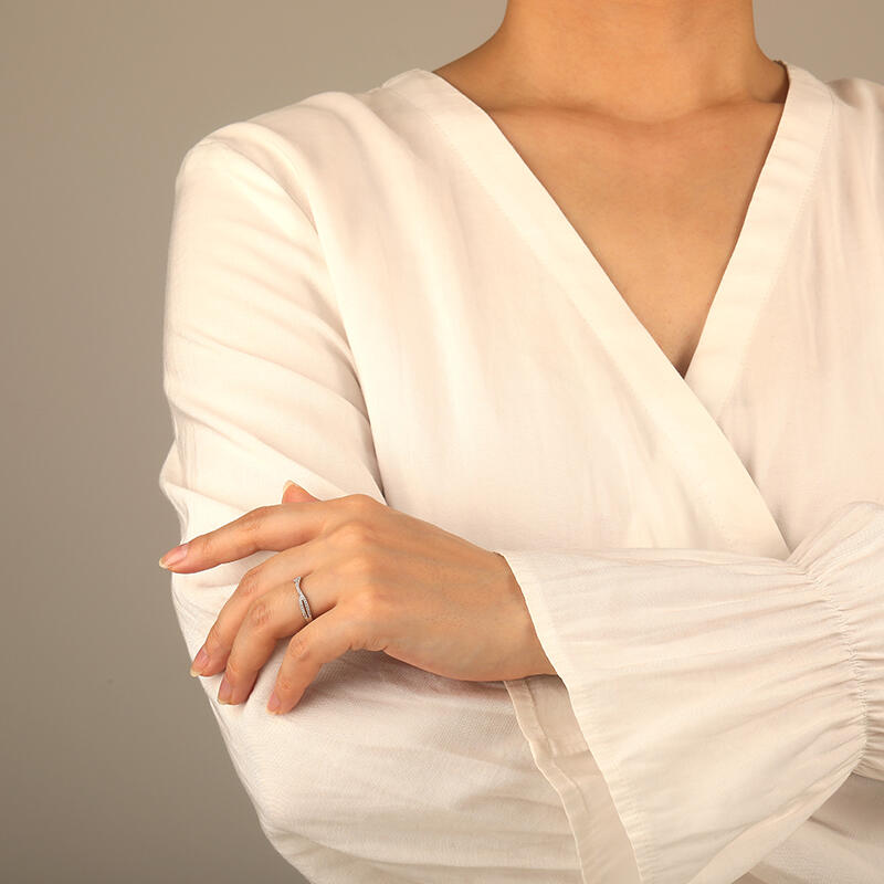 Klassische Trauringe, die alle Hochzeitswünsche erfüllen. Mit eleganter Torsionsspaltung und einer Reihe glitzernder Rundsteine in Pavé-Fassung. Das zarte Design unterstreicht die natürliche Schönheit jeder Frau - perfekt zu jedem Anlass.
