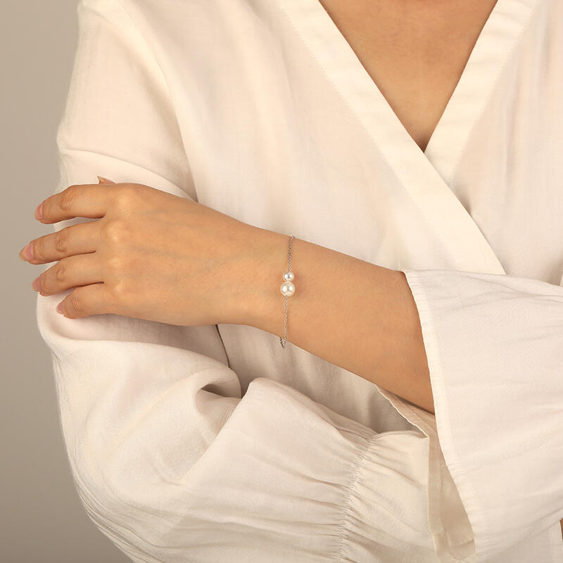 Einzigartige Perlenpoesie: Dieses Armband präsentiert zwei unterschiedlich große Perlen als kunstvolles Herzstück. Die harmonische Kombination aus klassischer Eleganz und moderner Individualität macht es zum perfekten Geschenk – ein Blickfang, der Ihre Persönlichkeit unterstreicht.