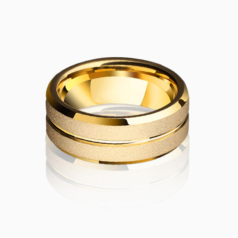 Dieser markante Ehering strahlt modernen Luxus aus mit seiner edlen Goldbeschichtung und dem reizvollen Texturkontrast. Die Sandstrahl-Optik schafft einen dezent robusten Hintergrund, während die polierten Facettenkanten und der Mittelkanal raffinierten Tiefeneffekt verleihen. Die klaren Linien und ausgewogenen Proportionen machen ihn zur zeitlosen Wahl für den anspruchsvollen Bräutigam.