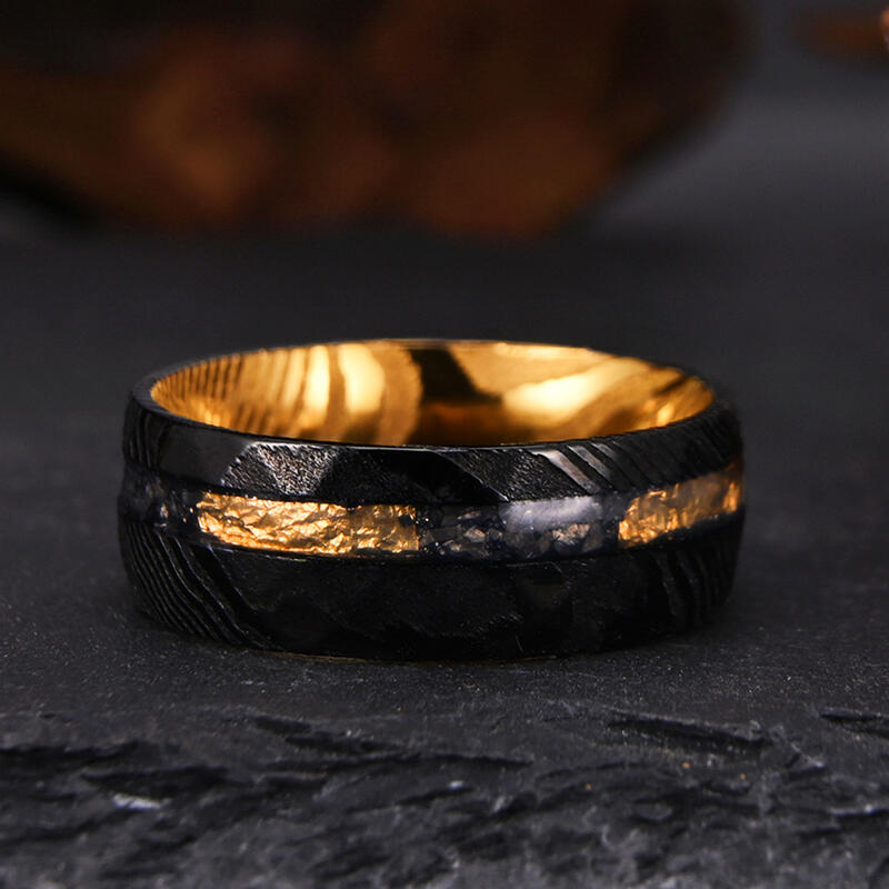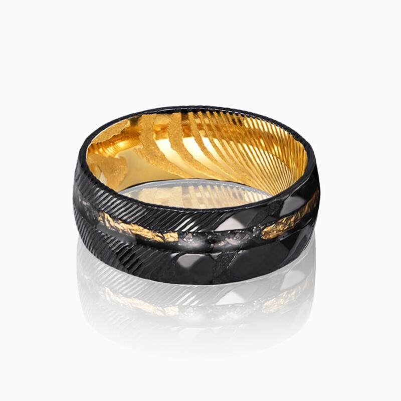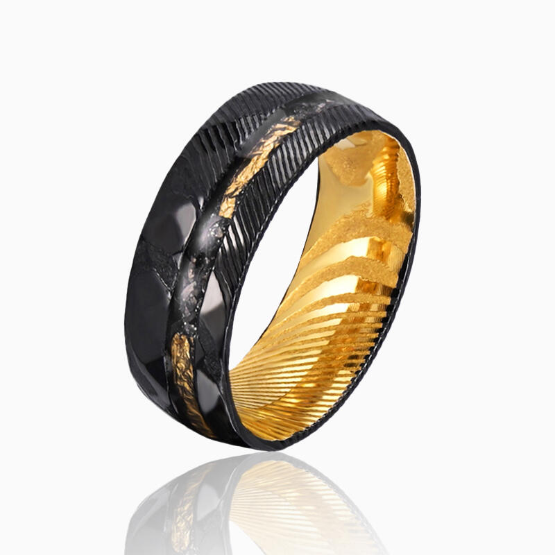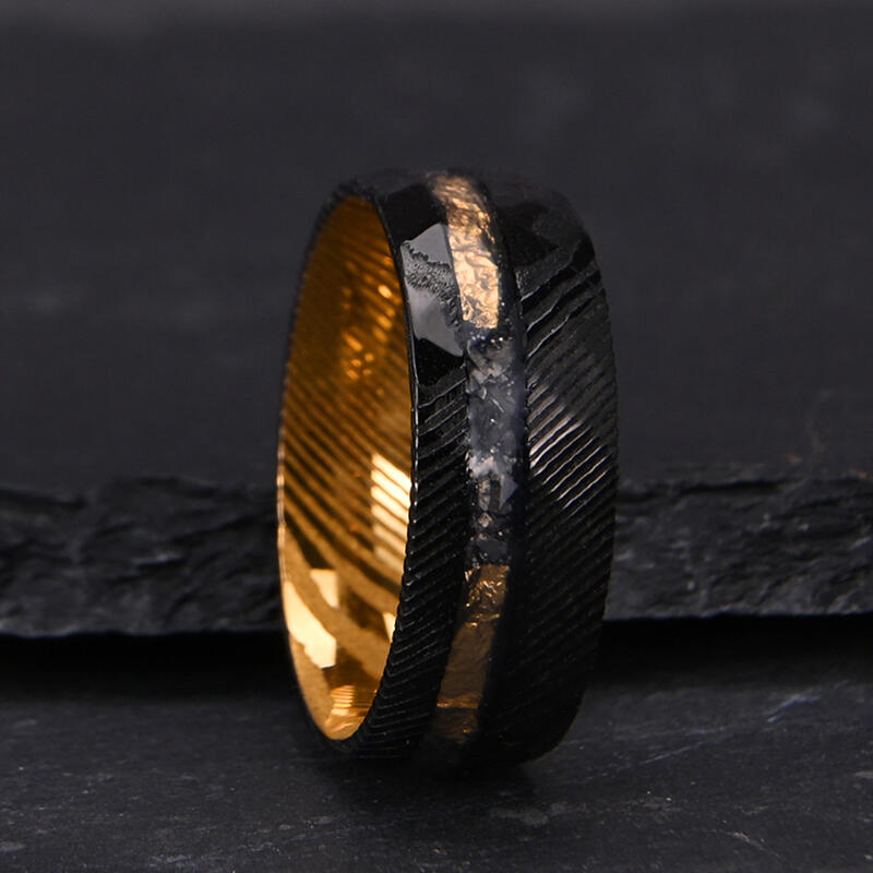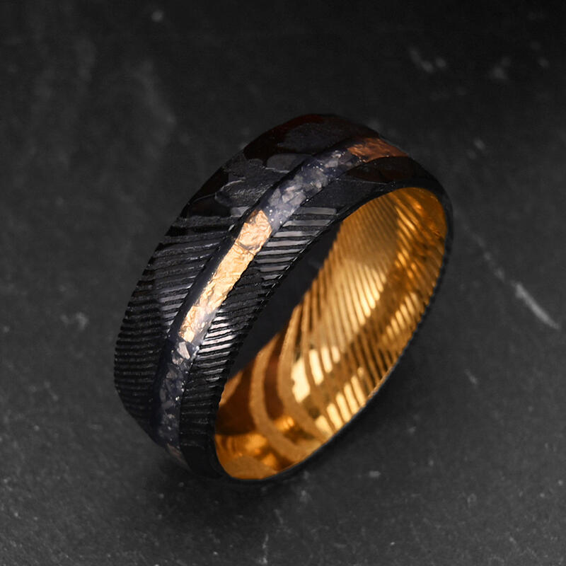 Dieser vornehme Herren-Ehering zeigt eine akribisch gehämmerte Damaszener-Stahl-Oberfläche, die eine robuste doch veredelte Textur kreiert. Meteoritenfragmente sind elegant eingelegt und verleihen dem Design eine überirdische Note. Zarte Goldfolienakzente durchziehen die Außenseite und setzen dezente Kontraste. Die Innenseite des Rings offenbart eine auffällige goldfarbene Beschichtung, die das komplexe Außendesign harmonisch ergänzt.