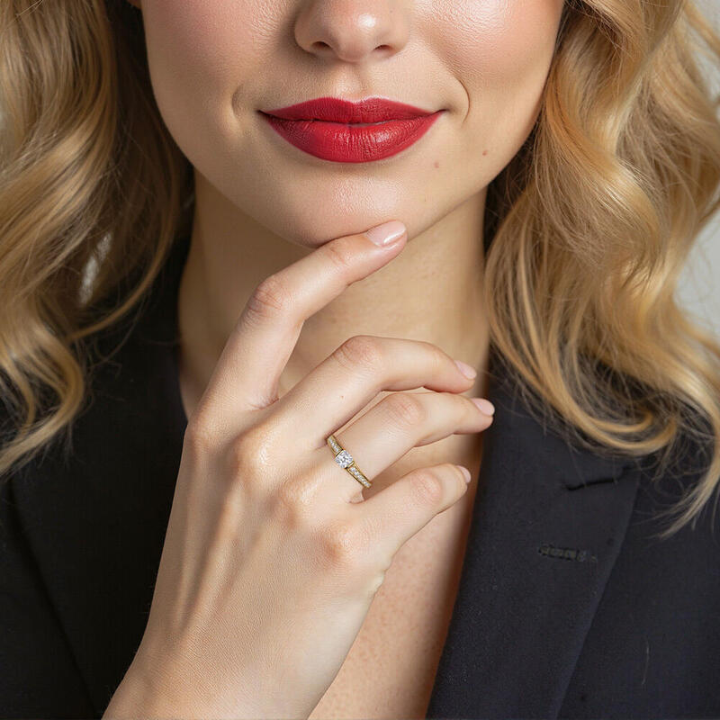 Besticht durch den makellosen Charme eines strahlend geschliffenen Mittelsteins in Spannungsfassung. Klassisch im Pavé-Setting eingefasste Rundsteine verleihen diesem Verlobungsring mit Seitensteinen zusätzlichen Glanz. Ich werde darauf warten, dass du die Milchstraße durchquerst und mich heiratest!