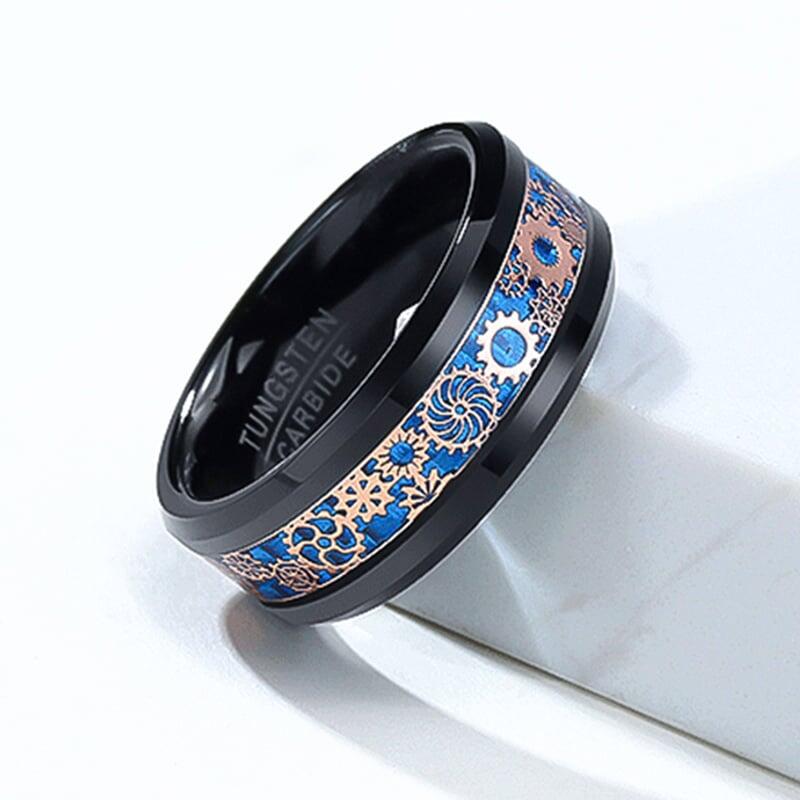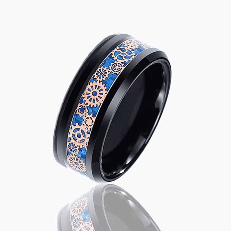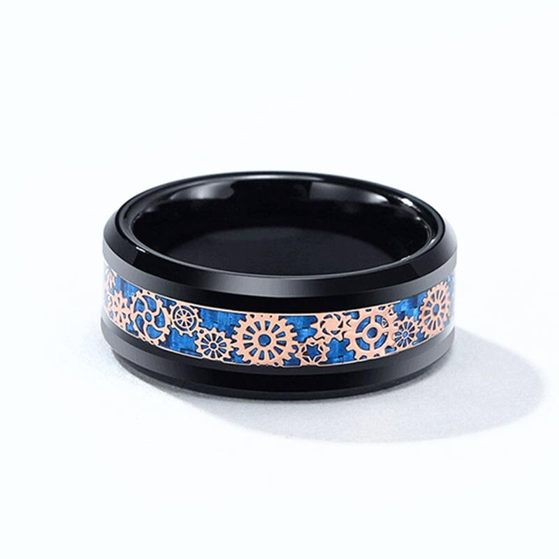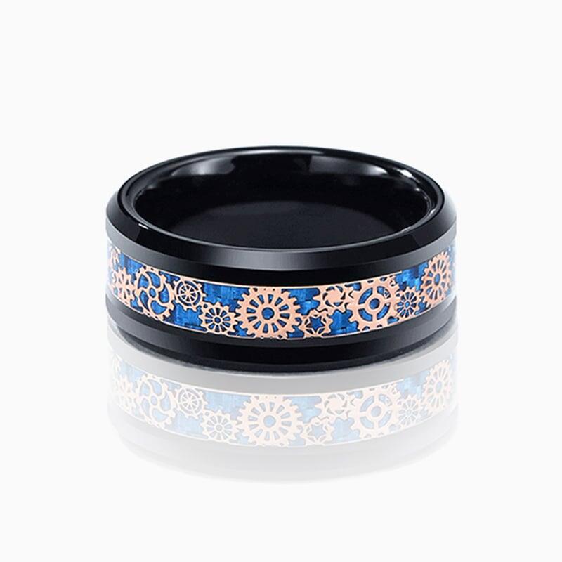 Dieser kühne Ehering aus schwarzer Zirkonkeramik vereint industrielle Schärfe mit präzisem Handwerk. Abgeschrägte Kanten erzeugen eine markante, eckige Silhouette, während filigrane, vom Steampunk inspirierte Zahnräder entlang einer Seite eingelassen sind. Ein leuchtend blaues Carbonfasereinlegewerk durchschneidet das Design und setzt einen Hightech-Kontrast zum vintage-mechanischen Motiv - perfekt für den Bräutigam, der unkonventionelle Details liebt.