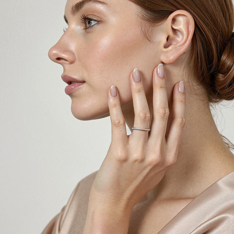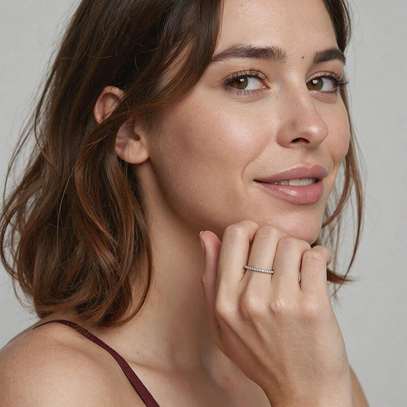 Glänzende Akzente und polierte Schäftung vereinen sich in einem schlichten Design, das Sie täglich tragen können. Mit diesem klassischen Halb-Ewigkeitstrauring können Sie nichts falsch machen. Er verkörpert mühelos Ihre Eleganz durch seine strahlende Schönheit. Das Kombinieren mit Ihrem Verlobungsring oder das Solo-Tragen sind gleichermaßen ideale Optionen – dieses zeitlose Design ist ein funkelndes Symbol Ihrer Liebe.