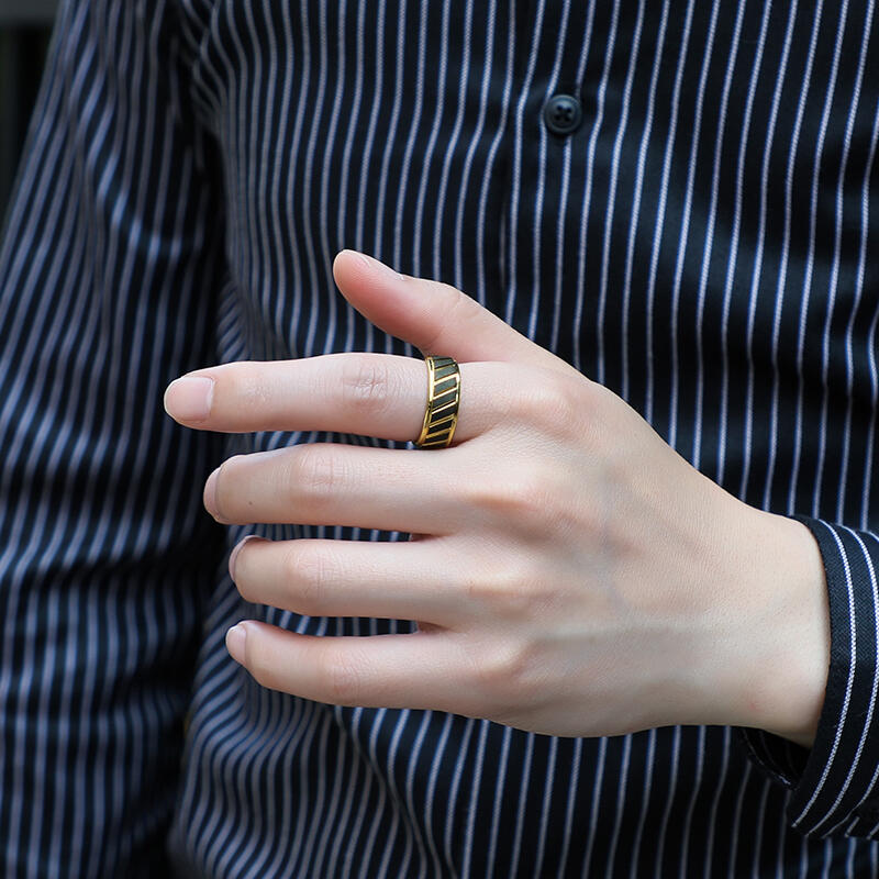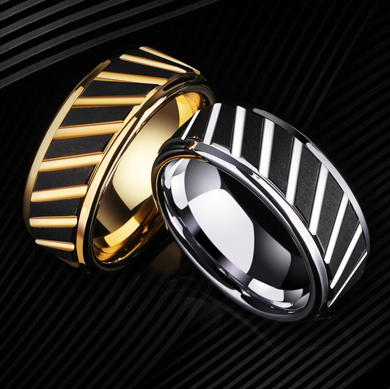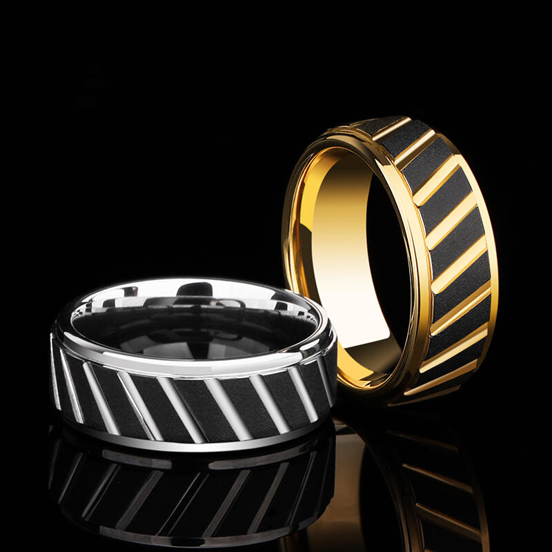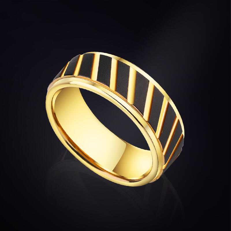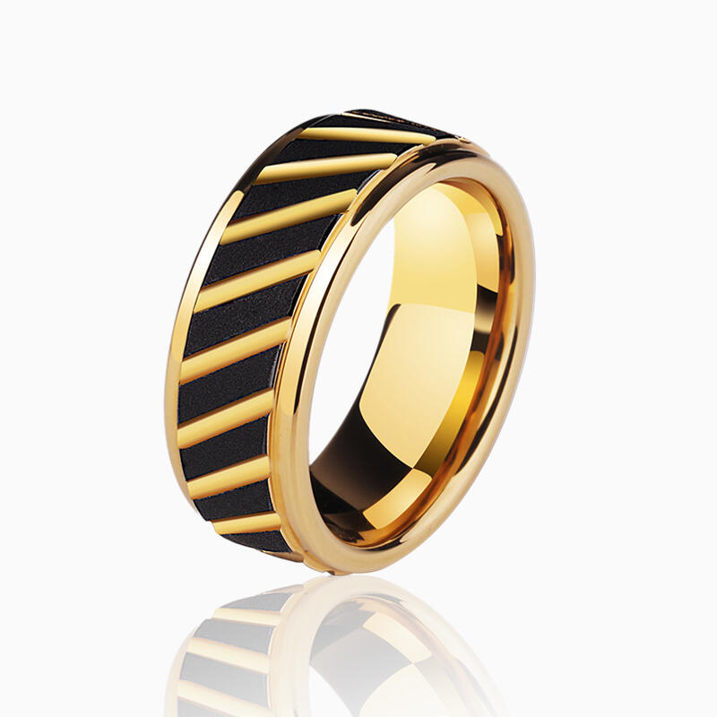 Dieser kühne Männer-Ehering vereint industriellen Stil mit raffinierten Details. Die goldfarbene Wolframkarbid-Basis kontrastiert mit einer markanten schwarzen Sandstrahl-Oberfläche und schafft einen robusten, dennoch veredelten Look. Winkelige Rillen verleihen dem Design eine dynamische Textur, während präzise Stufenkanten architektonische Tiefe hinzufügen.