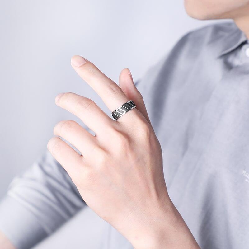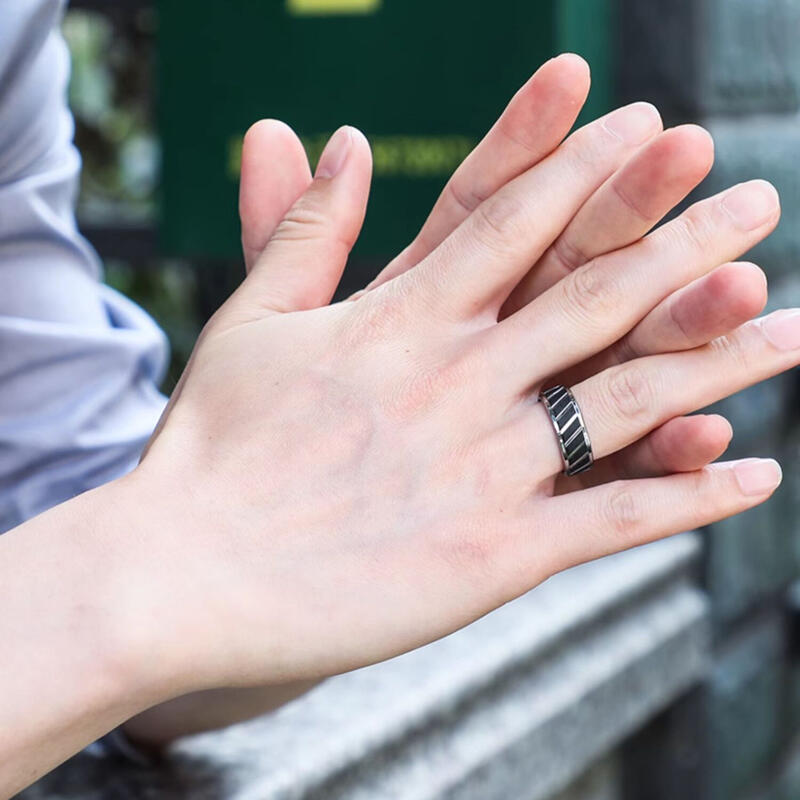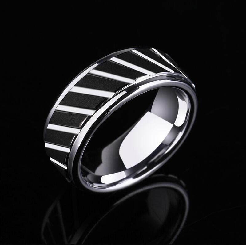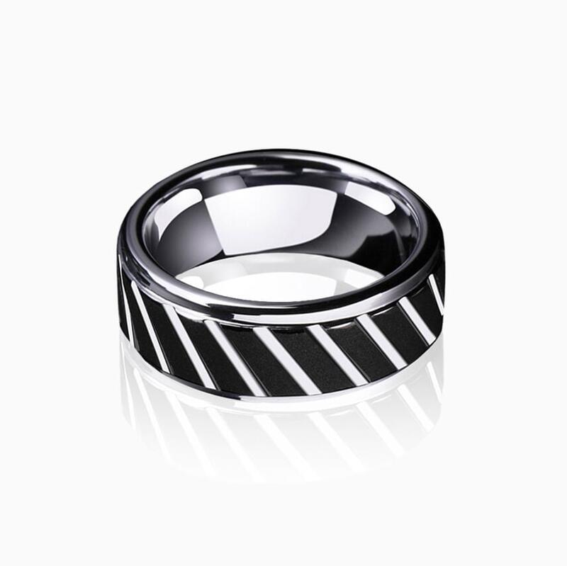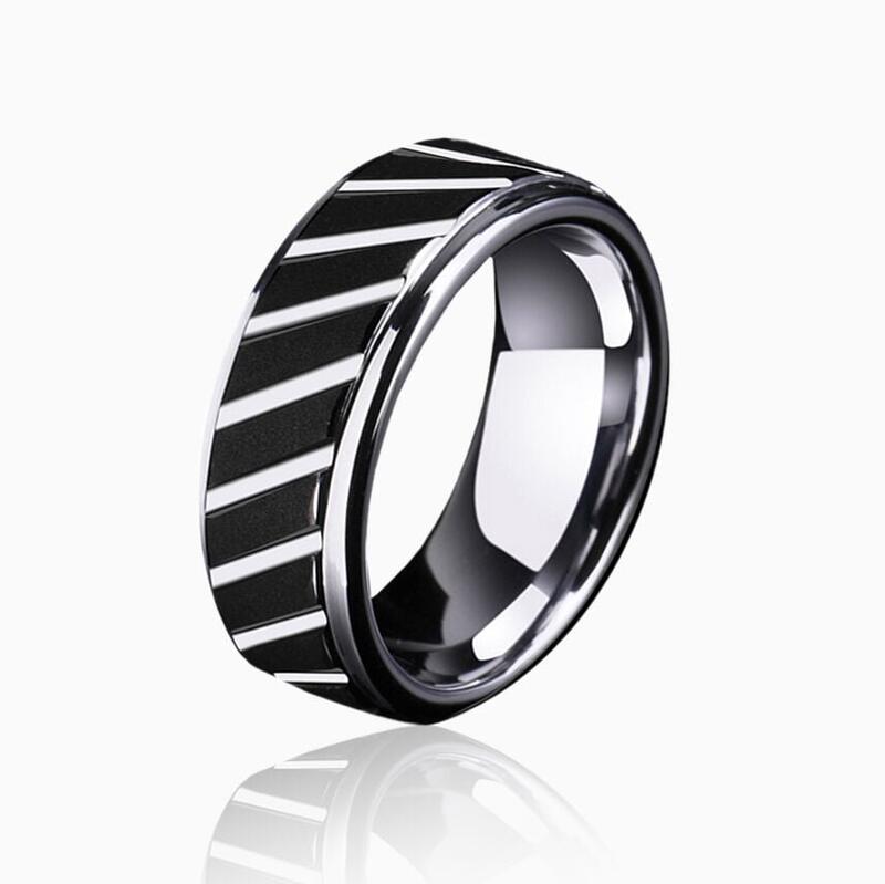 Dieser kühne Herren-Ehering verbindet industrielle Schärfe mit raffinierten Details. Die silberfarbene Wolframkarbid-Grundlage bildet einen markanten Kontrast zur schwarzen sandgestrahlten Oberfläche und schafft einen wilden, dennoch eleganten Look. Geometrische Rillen verleihen dem Design eine dynamische Textur, während präzise Stufenkanten architektonische Tiefenwirkung erzeugen.