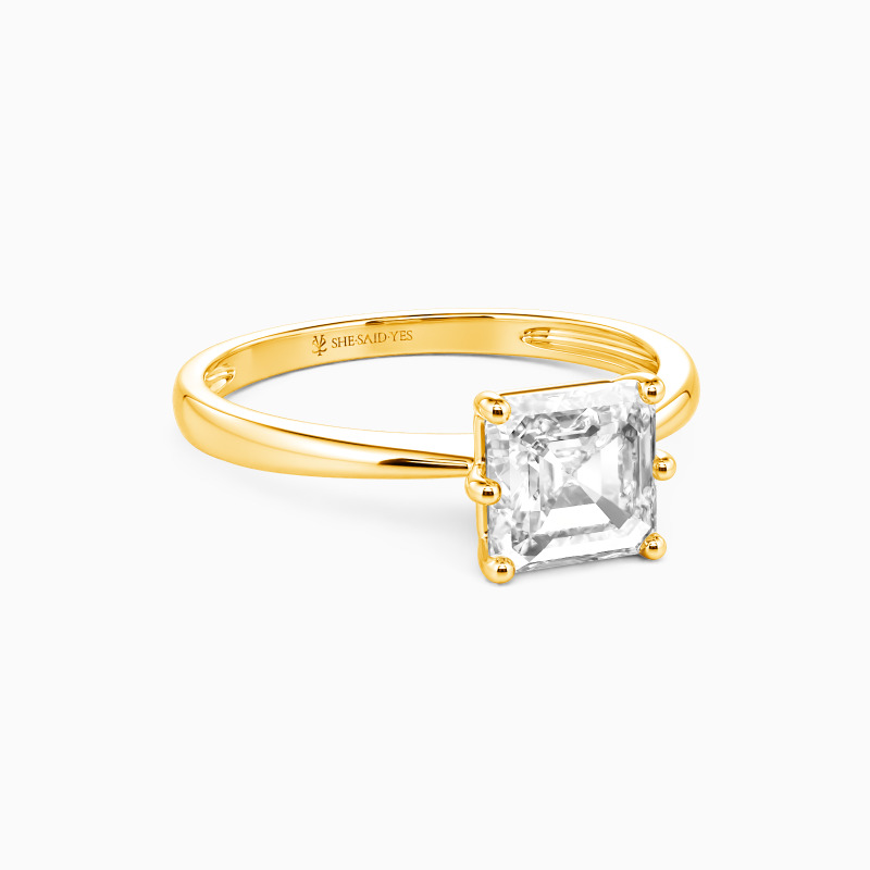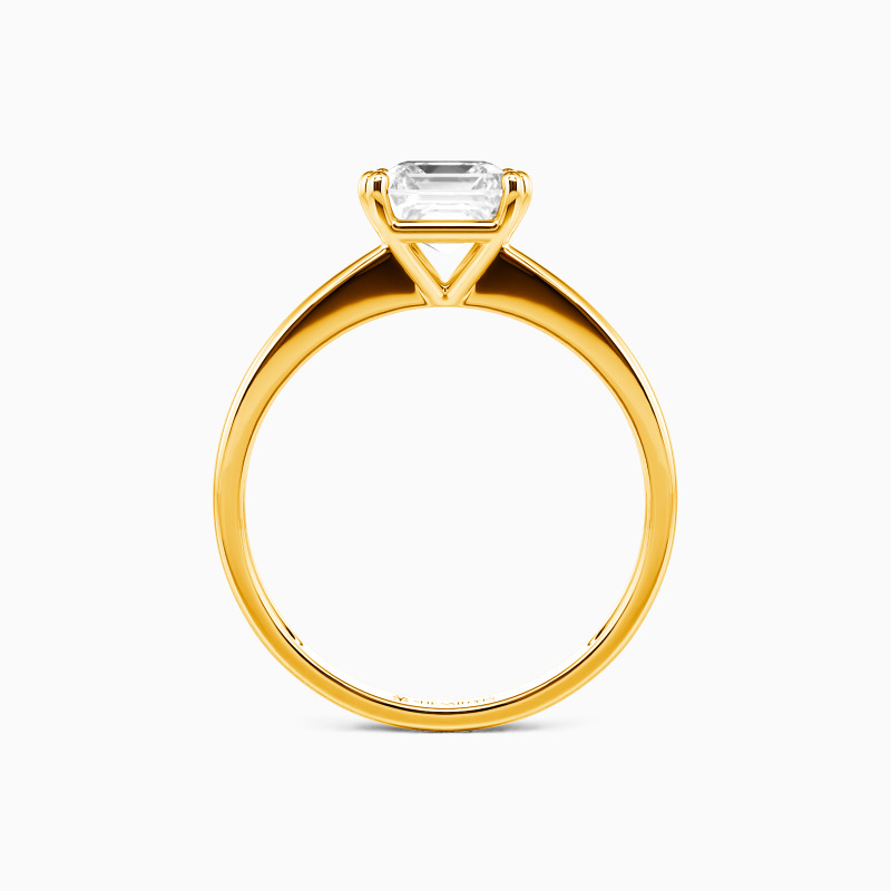 Dieses brillante Asscher-Solitärstück zeichnet sich durch klare, feinste Linien und exquisit geschwungene Schultern aus, die sich zum Mittelstein hin erheben. Mit diesem Solitär-Design sind Sie stets von strahlender Eleganz durchdrungen.