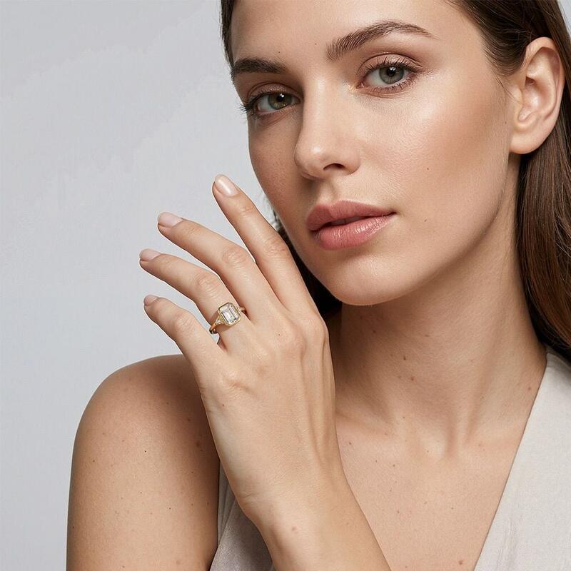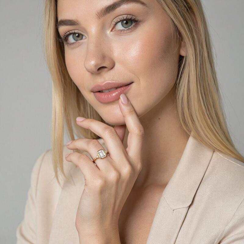 Dieser elegante Ring mit Seitensteinen feiert die Liebe mit Balance und Brillanz. Eine schlanke Zargenfassung präsentiert einen ruhigen Smaragdschliff-Mittelstein, dessen klare Linien von Klarheit und ewigem Versprechen sprechen. An jeder Seite fügen zarte Cluster von runden Edelsteinen einen sanften, festlichen Funken hinzu und umfassen die zentrale Vision Ihrer gemeinsamen Zukunft in einer harmonischen Symphonie des Lichts.