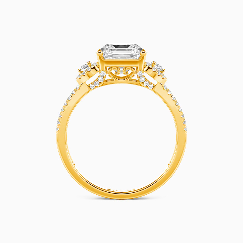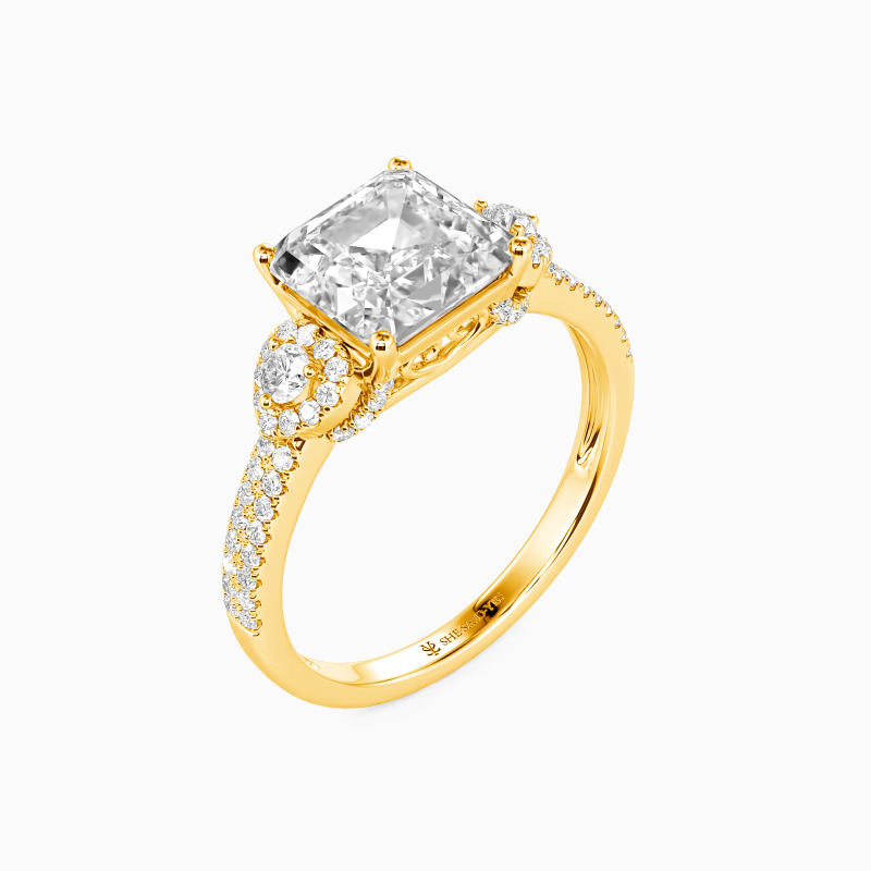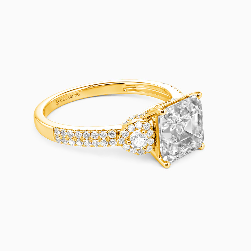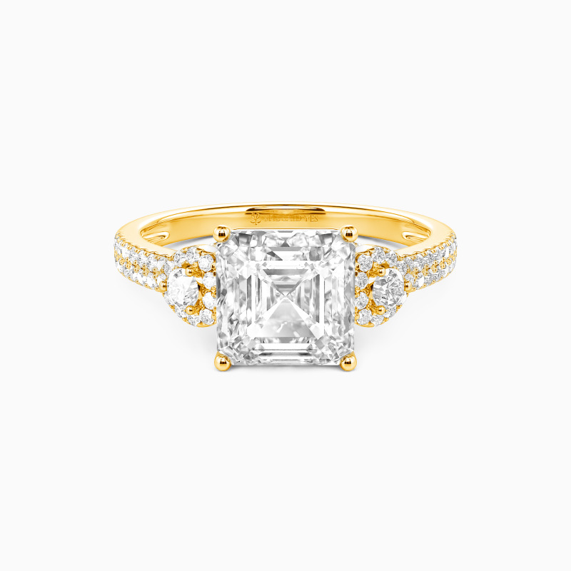Dieser exklusive Verlobungsring zentriert auf einem fesselnden Asscher-Schliff Stein, berühmt für seine zeitlose Geometrie und spiegelgalerieartige Brillanz. Romantisch umrahmt wird er von zwei zarten herzförmigen Halos, die ein emotionales Herzstück bilden. Das Design wird durch eine doppelte Reihe pavébesetzter Steine entlang der Schiene veredelt, die einen kontinuierlichen Schimmer erzeugen und den Finger mit Licht umspielen.