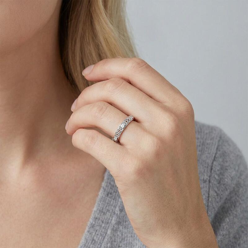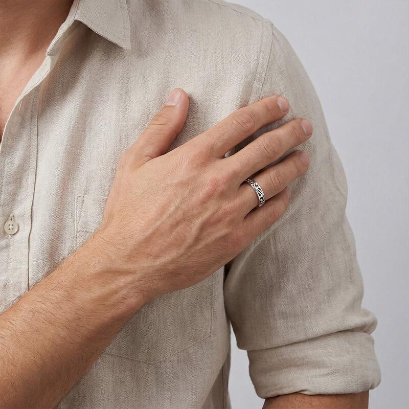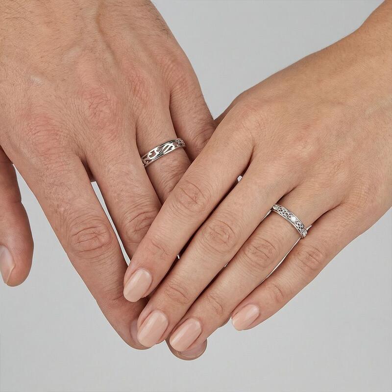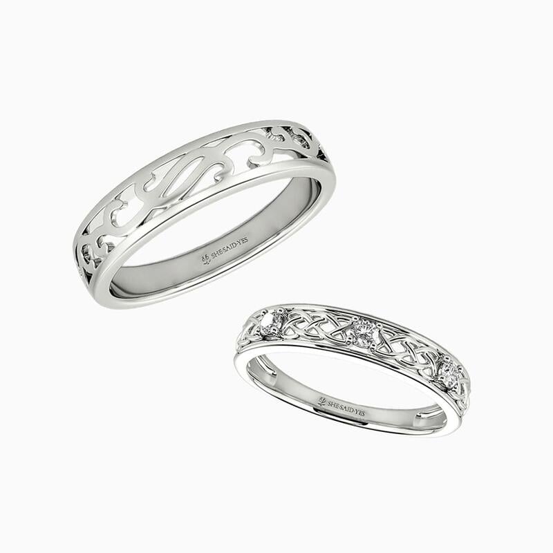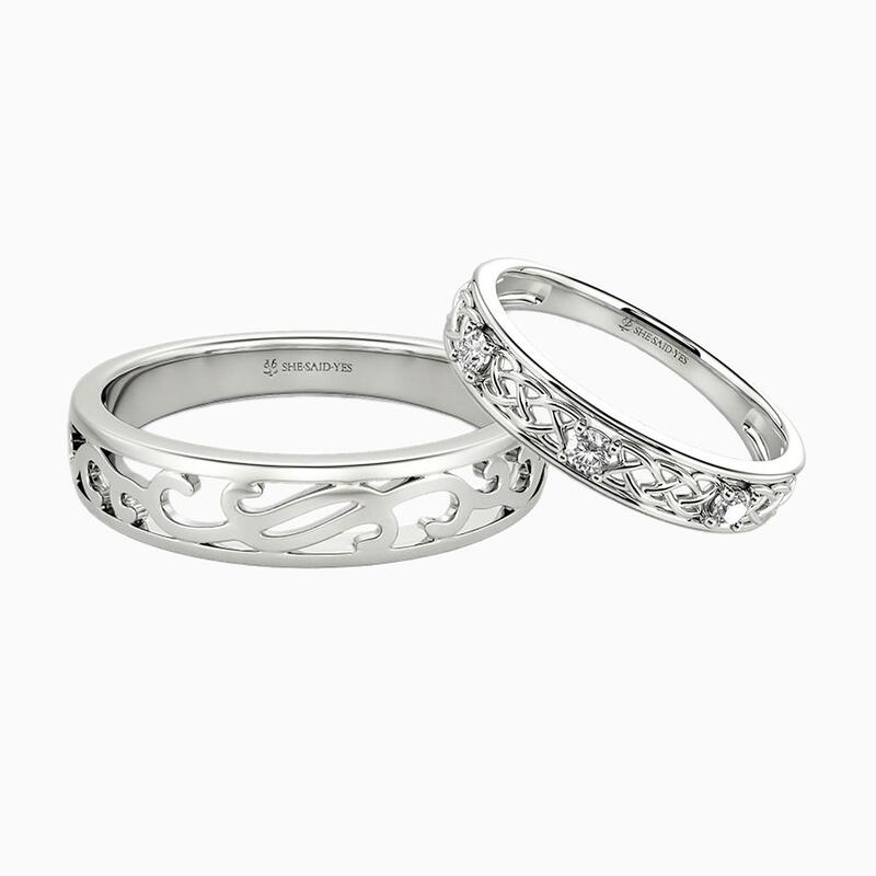 Diese Ringe feiern die ewige Verbindung durch kunstvolle Handwerkskunst. Ihr Band zeigt ein durchgehendes keltisches Knotenmuster in filigranem Durchbruch, besetzt mit drei leuchtenden Edelsteinen, die wie verborgene Schätze funkeln. Sein Design greift das Thema mit kräftigen, rankenartigen Mustern auf, die in das Metall geschnitten sind und ein faszinierendes Spiel von Schatten und Licht erzeugen. Gemeinsam erzählen sie eine zeitlose Geschichte der Verbundenheit.