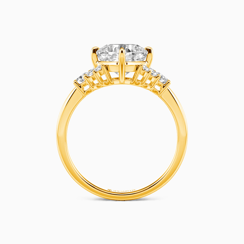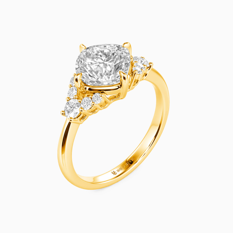 Dieser Verlobungsring mit Seitensteinen ist eine Vision sanfter Romantik und harmonischer Balance. Ein leuchtender Kissenssschliff-Mittelstein ruht wie ein geschätzter Traum und strahlt sanfte Wärme aus. Er wird zärtlich von symmetrischen Clustern runder Edelsteine flankiert, deren kollektives Funkeln einen Heiligenschein aus Freude und Schutz erzeugt. Das Design singt von einer Liebe, die sowohl tief tröstend als auch brillant feierlich ist.