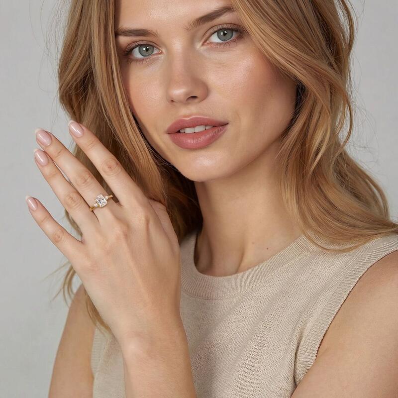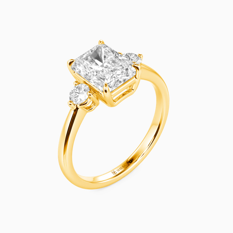Dieser exquisite Drei-Stein-Verlobungsring zelebriert zeitlose Liebe mit einem strahlenden Radiantschliff-Mittelpunkt, der anmutig von zwei leuchtenden runden Steinen umrahmt wird. Der sich verjüngende Schaft verstärkt seine zarte Raffinesse und lenkt den Blick auf die harmonische Anordnung. Eine perfekte Balance von Brillanz und Anmut, symbolisiert dieses Design Vergangenheit, Gegenwart und Zukunft - für immer verwoben in strahlendem Licht.