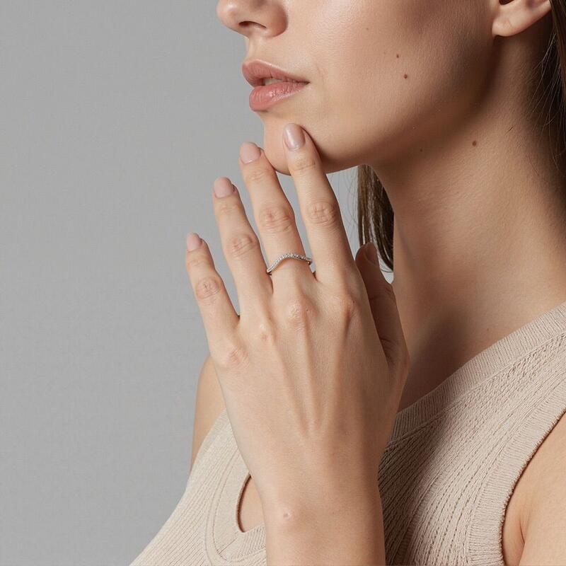 Dieser klassische und dennoch vielseitige Ehering strahlt zeitlosen Charme aus. Seine sanft geschwungene Silhouette ermöglicht eine nahtlose Kombination mit verschiedenen Verlobungsring-Stilen. Die Pavé-Fassung verleiht einen faszinierenden Glanz und erhöht die Eleganz des Rings. Ob allein oder als Teil eines Sets getragen, dieser Ring bietet dauerhafte Schönheit und Anpassungsfähigkeit.