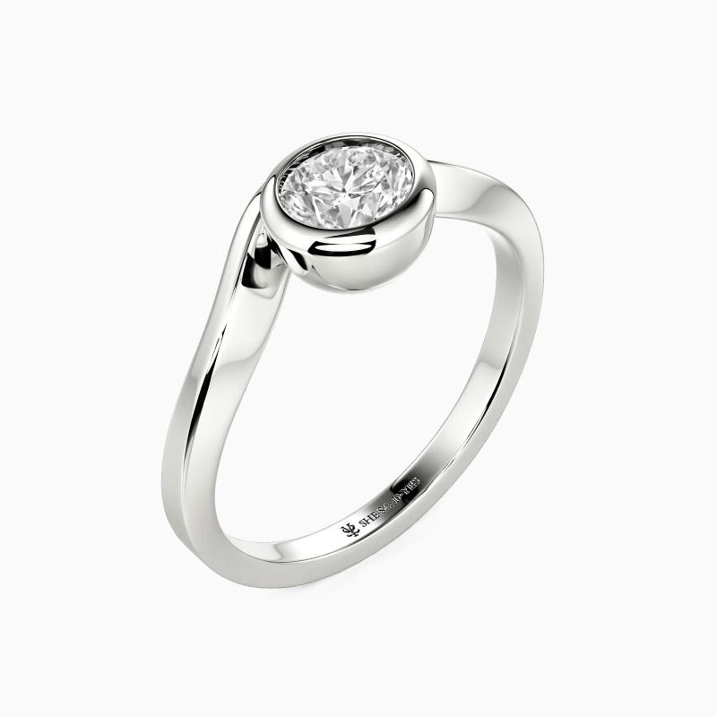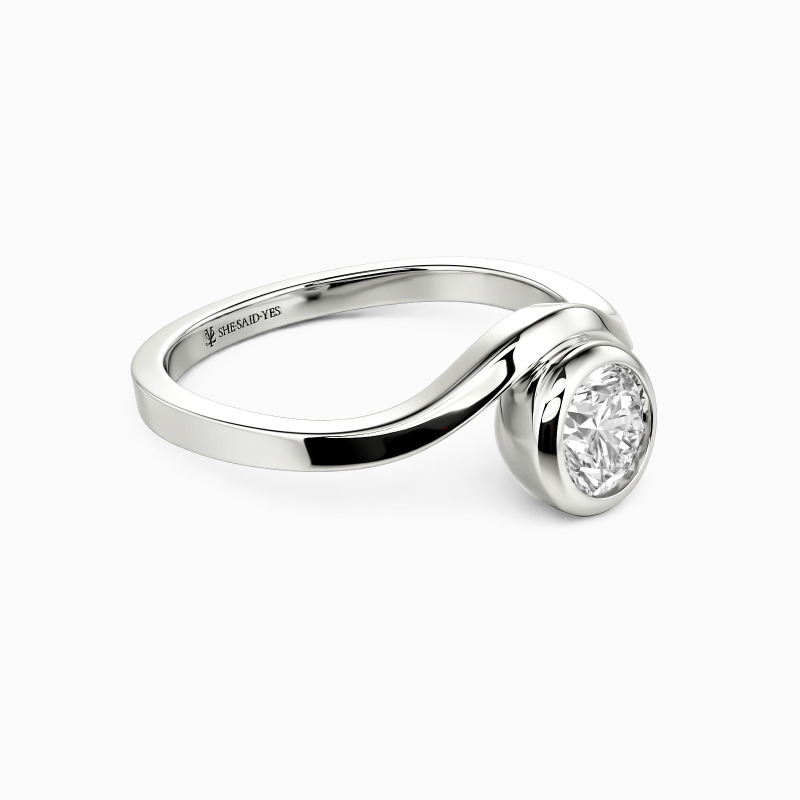 Dieser Solitärring definiert skulpturale Eleganz neu und präsentiert einen runden Edelstein, eingebettet in einer schlanken Zargenfassung. Der hochglanzpolierte, gebogene Schaft fließt anmutig und erzeugt die Illusion von flüssigem Metall, das den Finger umschließt. Dieses avantgardistische Design vereint minimalistische Raffinesse mit künstlerischem Flair und verkörpert die fließende Natur moderner Romantik, während es eine zeitlose Ausstrahlung bewahrt.