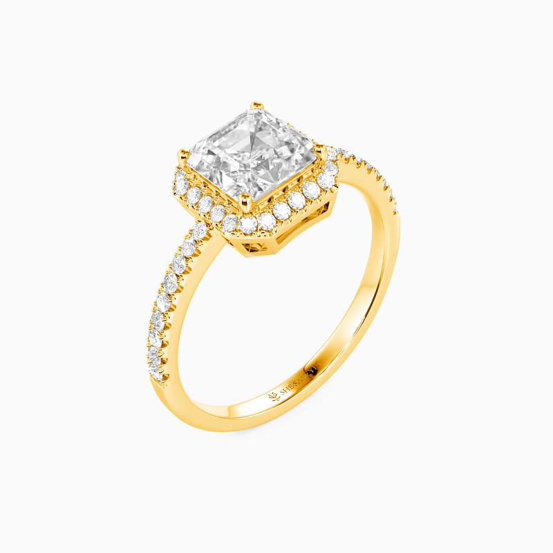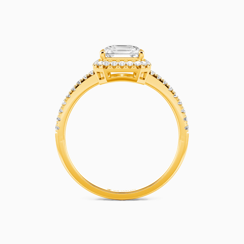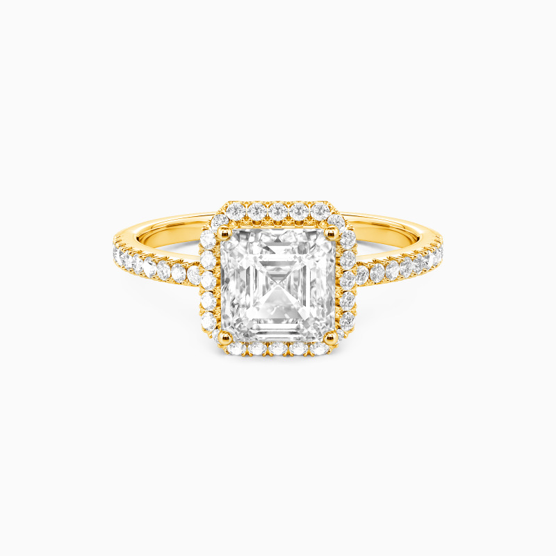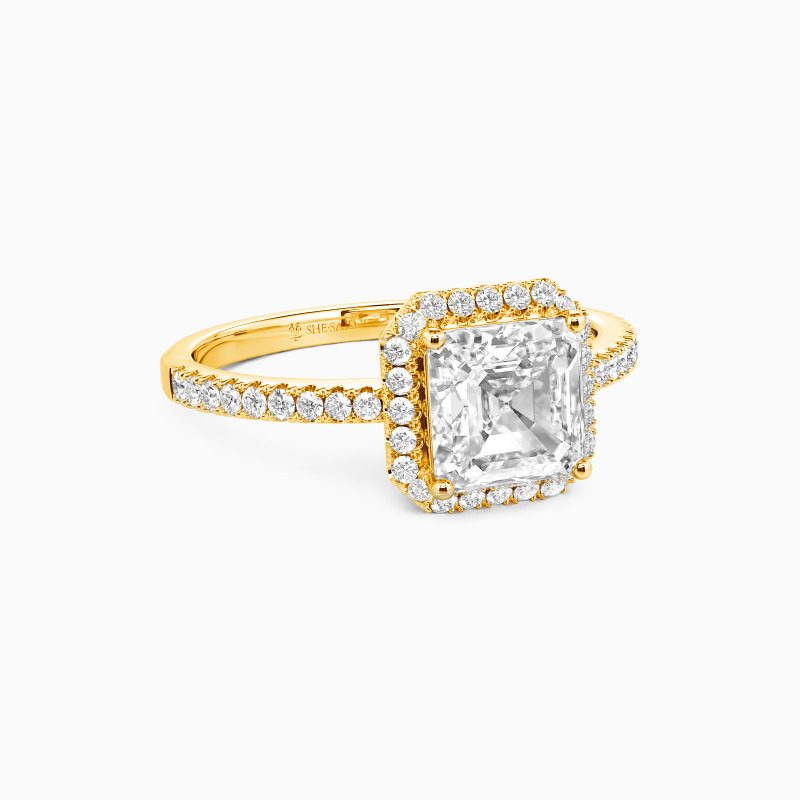 Dieser Verlobungsring besticht durch einen atemberaubenden Asscher-Schliff im Mittelpunkt. Ein zartes Halo verstärkt seine Schönheit mit unvergleichlicher Brillanz und betont seine Größe. Zudem schmückt eine Reihe funkelnder Seitensteine den Ring, die dieses zeitlose Design mit einer Note von Eleganz versehen. Dieses ewige Andenken ist so kostbar wie der Mensch, den Sie lieben, und sollte für die Ewigkeit bewahrt werden.