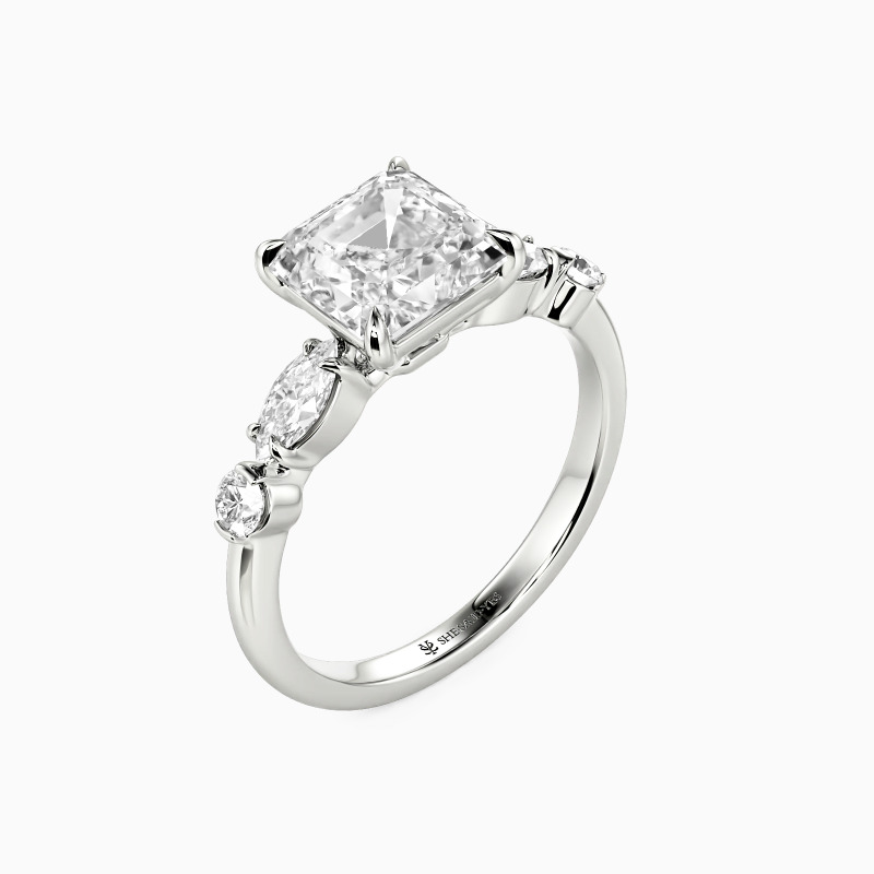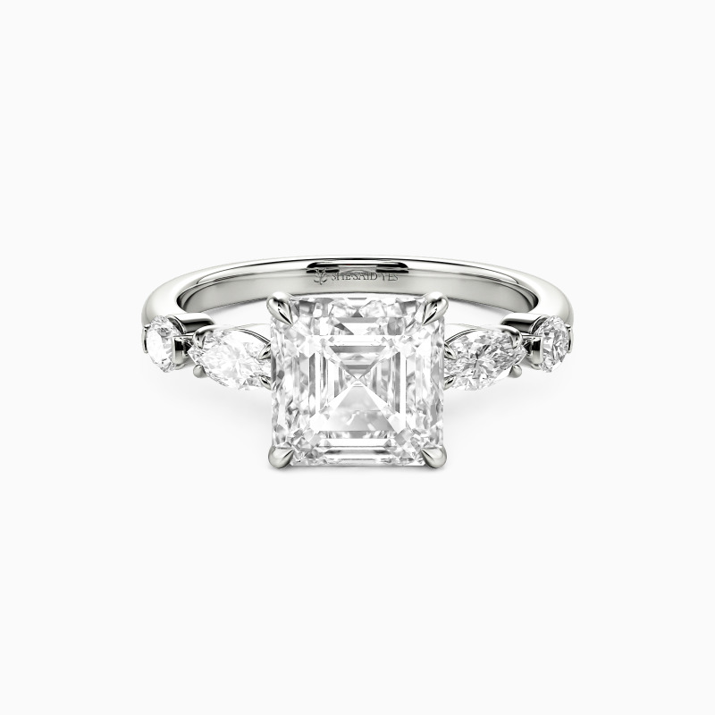 Eine zeitlose Silhouette – dieser Verlobungsring präsentiert einen funkelnden Asscher-Schliff-Zentralstein, dessen architektonische Facetten von einem Spiel runder und marquiseförmiger Akzente umrahmt werden. Das Zusammenspiel weicher Kurven und markanter Verlängerungen erzeugt einen Rhythmus aus Licht und Bewegung und kreiert ein Design, das sowohl bewusst gestaltet als auch mühelos romantisch wirkt.