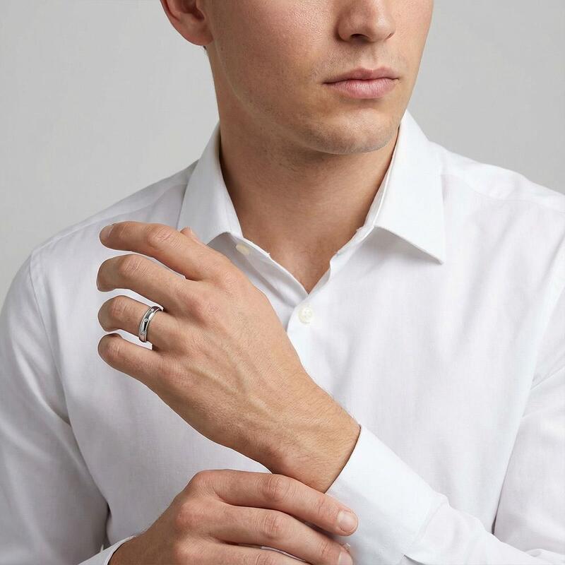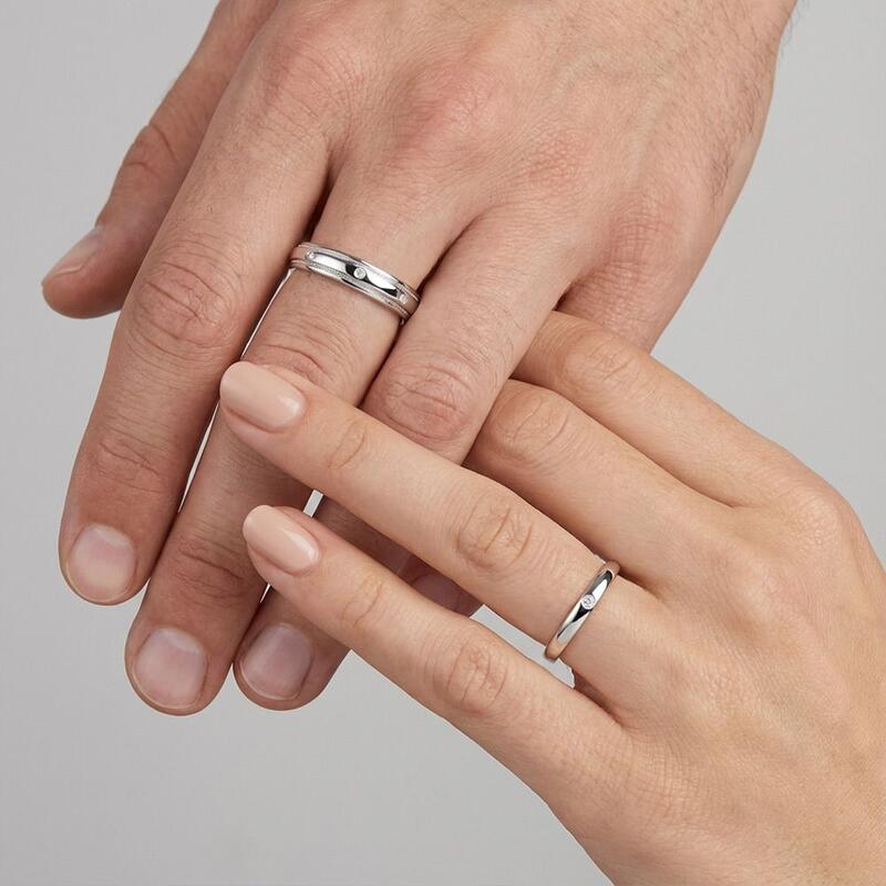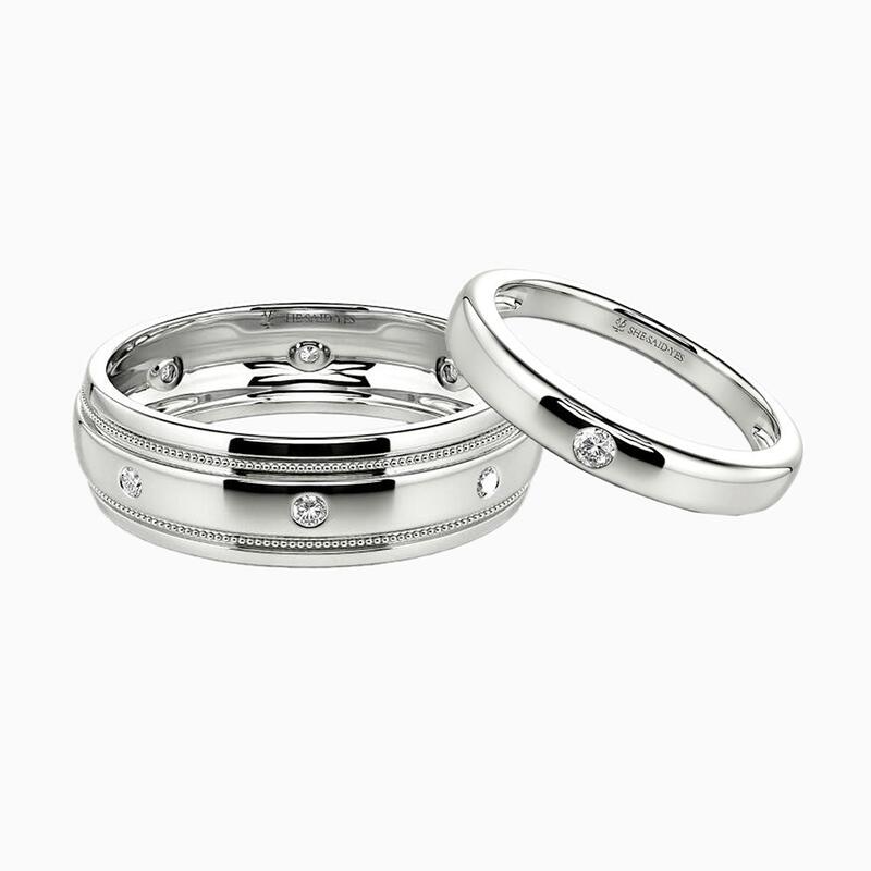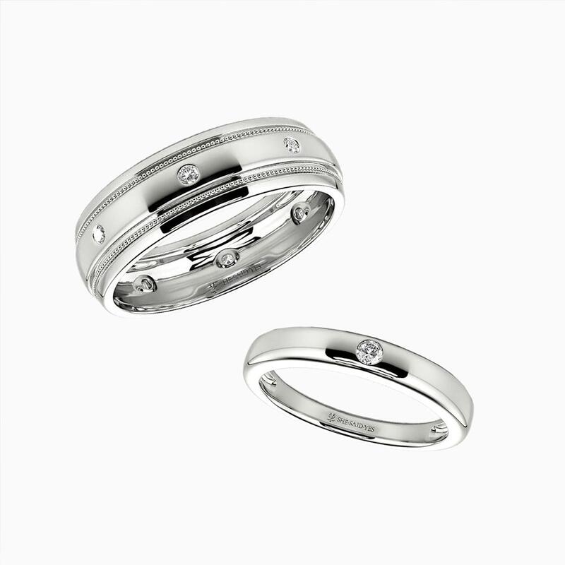 Diese Paarringe vereinen polierte Eleganz mit harmonischen Akzenten. Der Damenring mit Hochglanzpolitur präsentiert einen Runddiamanten in schlichter Burnish-Fassung. Sein Pendant spiegelt den Glanz wider: Acht Diamanten sind entlang der Schulter verteilt, mit Perlrand-Verzierungen an den Kanten – eine stilvolle Verbindung ihrer raffinierten Designs durch gemeinsame Strahlkraft.
