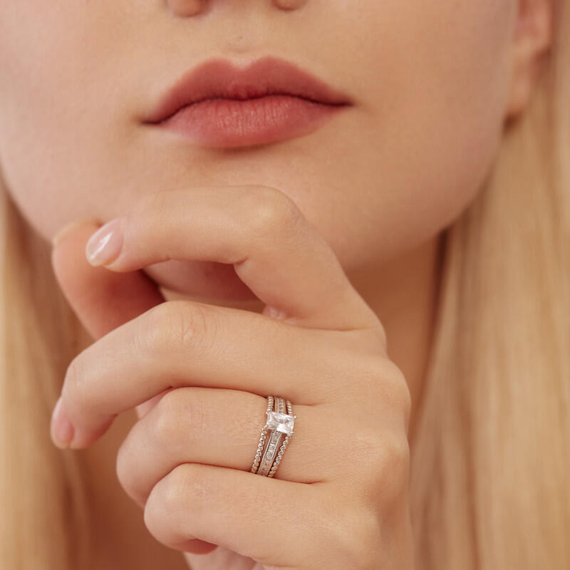 Dieser Seitenstein-Verlobungsring vereint modernes und vintage-inspiriertes Design zu einem wunderschönen Gesamtbild. Das geflochtene Muster und die funkelnden Akzente in einer klassischen Kanalfassung am Ringkörper lassen den zentralen Radiantschliff-Stein mehr Licht reflektieren. Ein Leben, eine Liebe, eine Seele, ein Herz, ein Partner. Deins ist meins, und meins ist deins.