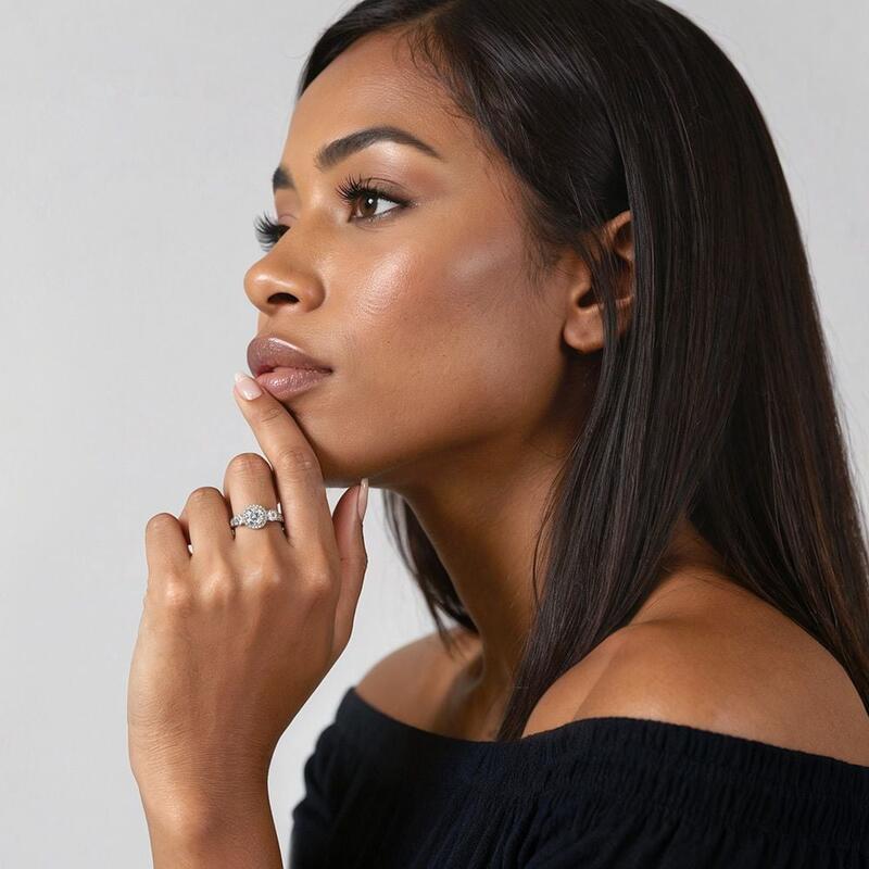 Zart, verträumt und von unvergleichlicher Weiblichkeit – dieser atemberaubende Verlobungsring verwirklicht Traumvorstellungen. In Zweifarben-Design präsentiert er einen funkelnden Rundschliff-Zentralstein, umgeben von einem strahlenden Heiligenschein und flankiert von zwei kleineren Rundsteinen. Der polierte Schaft, besetzt mit mehreren Princess-Schliff-Steinen, macht ihn zur perfekten Wahl für Ihre Liebste.