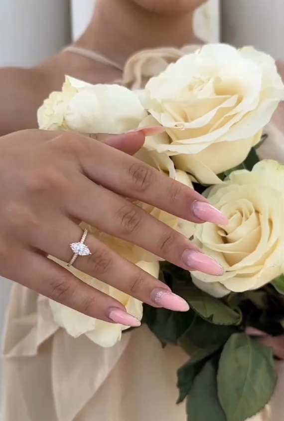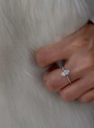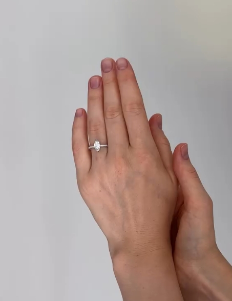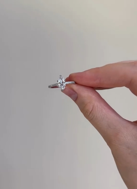 Ein klassischer Verlobungsring präsentiert die minimalistische Ästhetik des Schmucks. Er ist mit einem großen, marquisegeschliffenen Edelstein in vier Halteklauen gefasst, und die funkelnden Steine betonen den schlanken Schaft auf wunderschöne Weise. Ein raffiniertes Stück, das sie lieben wird.