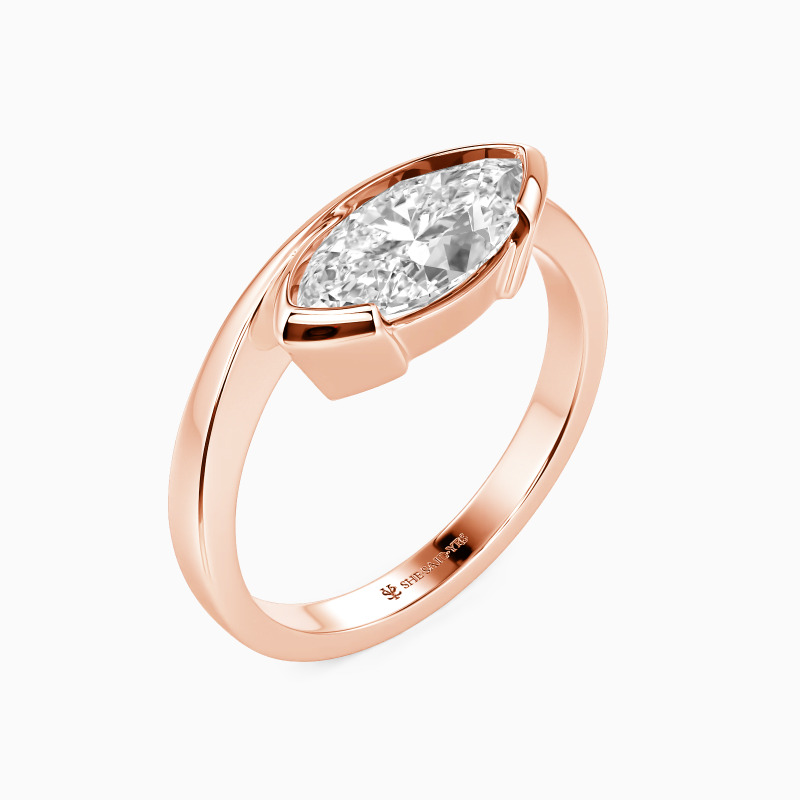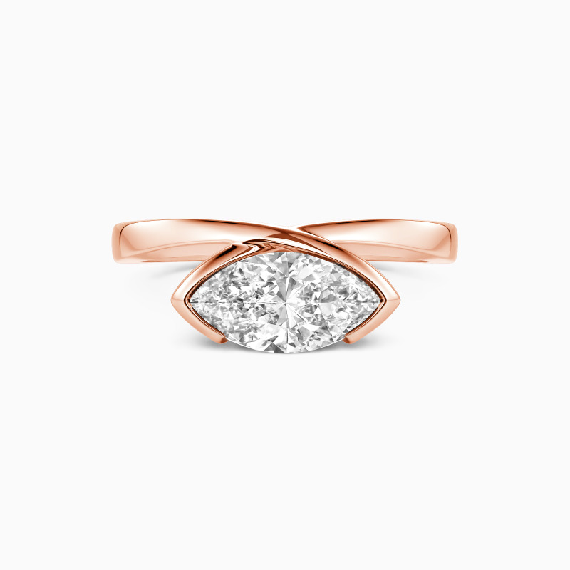 Kühn zeitgenössisch interpretiert dieser Solitärring die Tradition mit seinem auffälligen Design neu. Ein marquiseförmiger Edelstein, ost-westlich in einer Teilzargenfassung gesetzt, schafft einen unerwarteten Blickfang. Der sich kreuzende Schaft fügt eine skulpturale Faszination hinzu, wobei seine sich schneidenden Linien die Konvergenz zweier Wege symbolisieren. Dieses avantgardistische Stück feiert Individualität und Verbundenheit und bietet eine frische Interpretation zeitloser Romantik für den modernen, stilbewussten Träger.