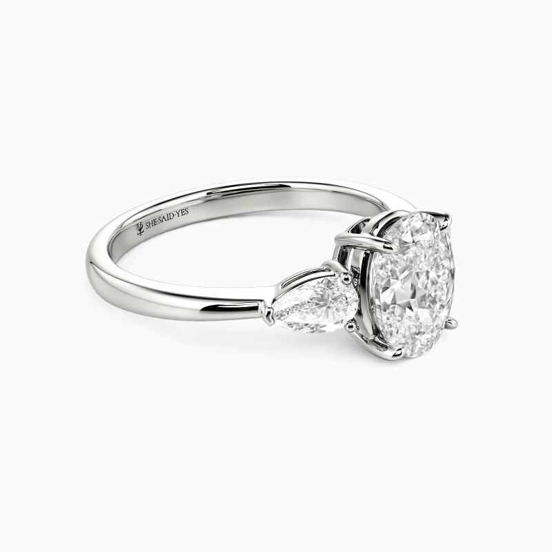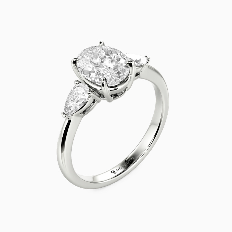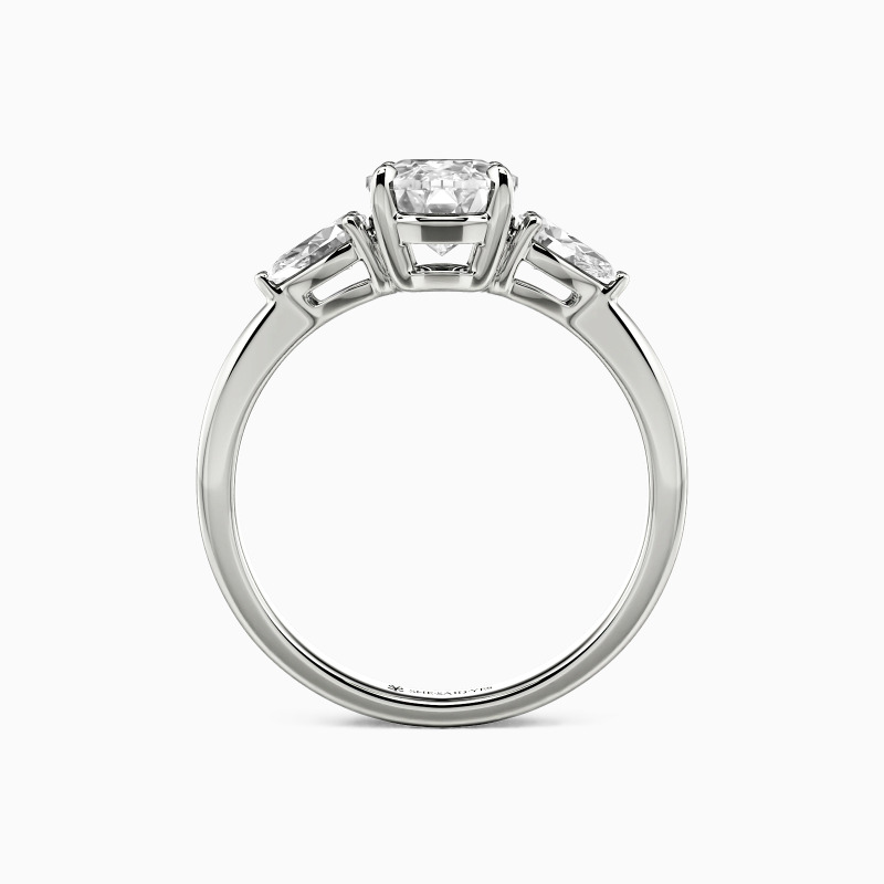 Dieser Verlobungsring mit drei Steinen ehrt poetisch Vergangenheit, Gegenwart und Zukunft. Ein leuchtender ovaler Mittelstein, der ein geschätztes Heute repräsentiert, wird anmutig von zwei birnenförmigen Edelsteinen flankiert. Ihre eleganten Tropfenformen zeigen nach außen und symbolisieren eine gemeinsame Reise in die Zukunft, während das harmonische Trio als konstante, funkelnde Erinnerung an eine Liebe leuchtet, die mit der Zeit immer schöner wird.