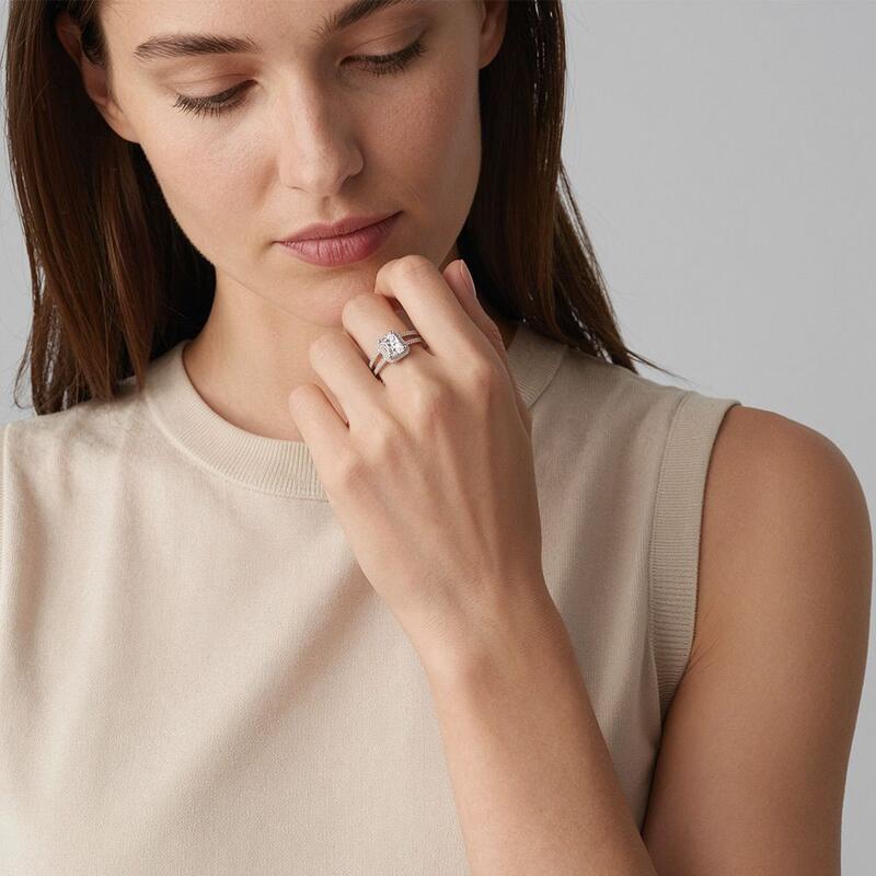 Dieser atemberaubende Halo-Verlobungsring vereint zeitlose Eleganz mit modernem Twist. Der strahlend geschliffene Mittelstein zieht alle Blicke auf sich, sein Glanz wird durch einen funkelnden Halo verstärkt, der die Größe optisch betont. Der geteilte Schaft, mit Pavé-Steinen besetzt, teilt sich anmutig und vereint sich wieder – ein Symbol zweier Wege, die zu einem werden. Dieses exquisite Design bietet die perfekte Balance aus Glamour und Eleganz und ist damit ein strahlendes Zeugnis ewiger Liebe.