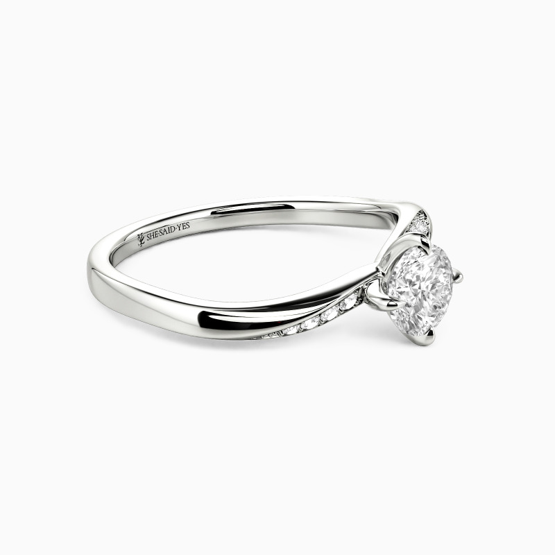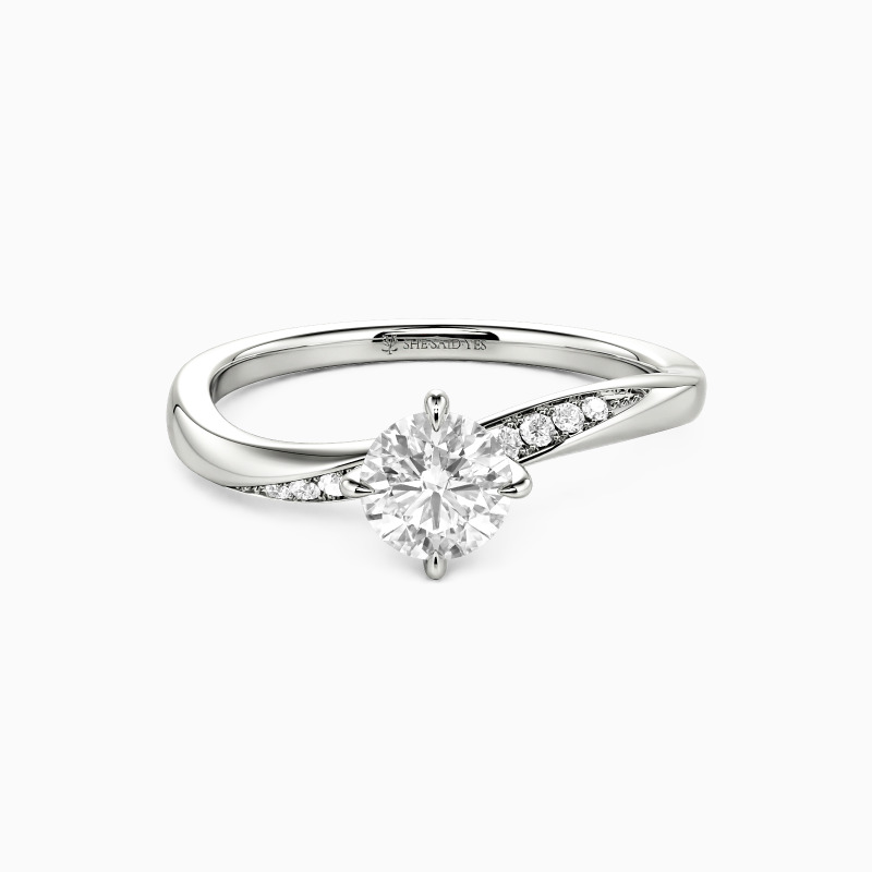 Fließende, von Wellen inspirierte Kurven ziehen sich über die Schiene dieses modernen Verlobungsrings. Ein brillanter Rundschliff-Mittelstein erhebt sich aus der geschwungenen Fassung, akzentuiert durch schimmernde Steine, die entlang der polierten Kanten fließen. Dieses elegante Design fängt die rhythmische Bewegung des Ozeans ein und symbolisiert eine Liebe, die durch alle Gezeiten hinweg beständig bleibt.