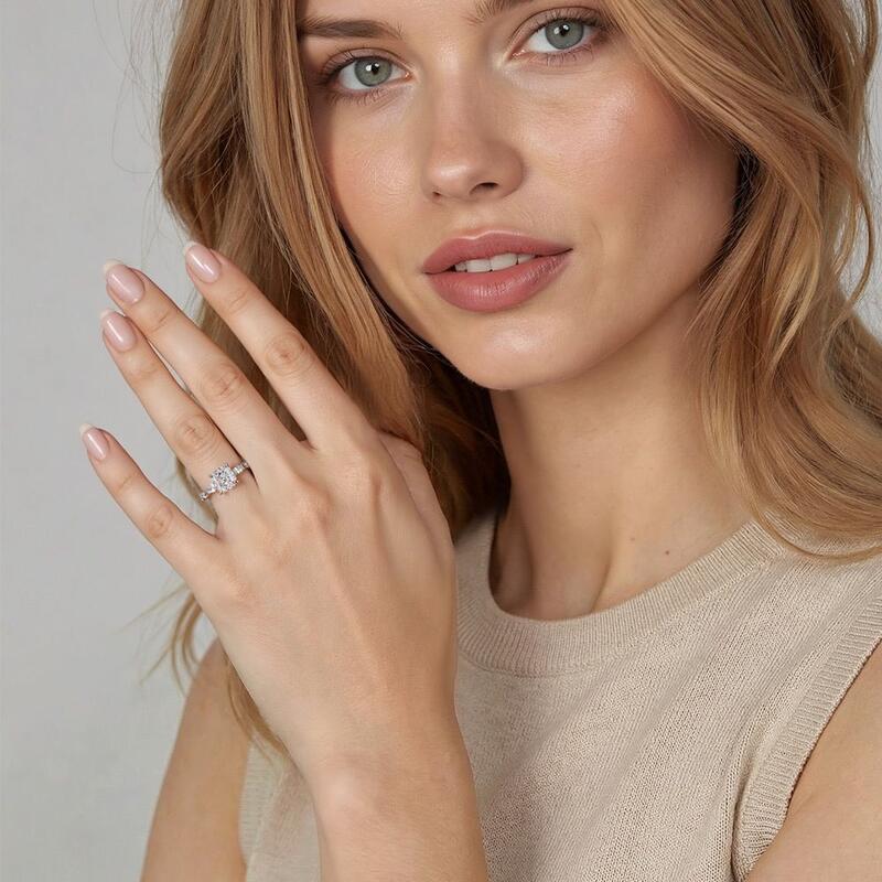 Dieser exklusive Verlobungsring mit Seitensteinen zeigt einen sanft strahlenden Kissenschliff-Mittelstein, elegant umrahmt von einer filigranen Anordnung aus Marquise- und Rundsteinen. Die abwechselnden Formen erzeugen ein dynamisches Lichtspiel, das weiche Kurven mit geschmeidigen Winkeln für eine ausgewogene und dennoch auffällige Wirkung verbindet. Ein zeitloser und doch moderner Liebesausdruck, perfekt für ein Leben voller kostbarer Momente.