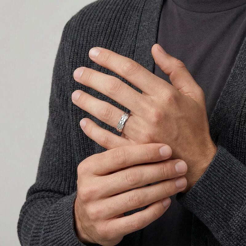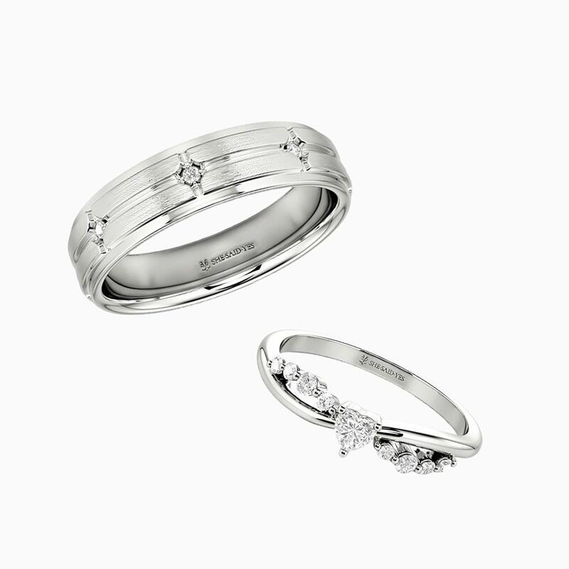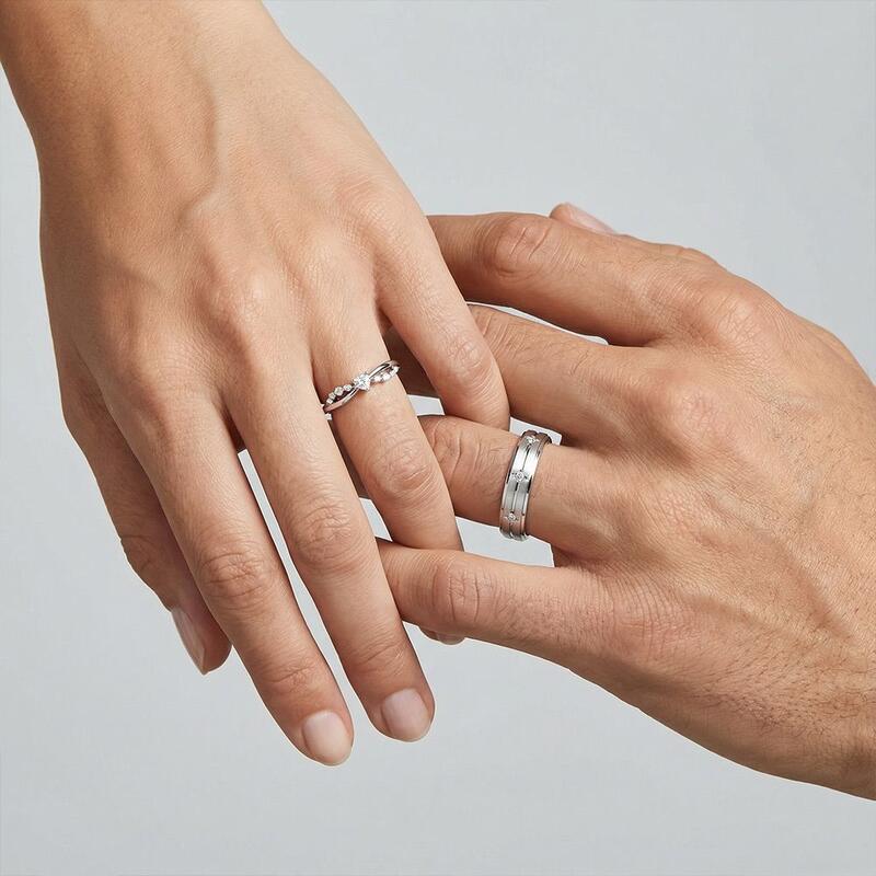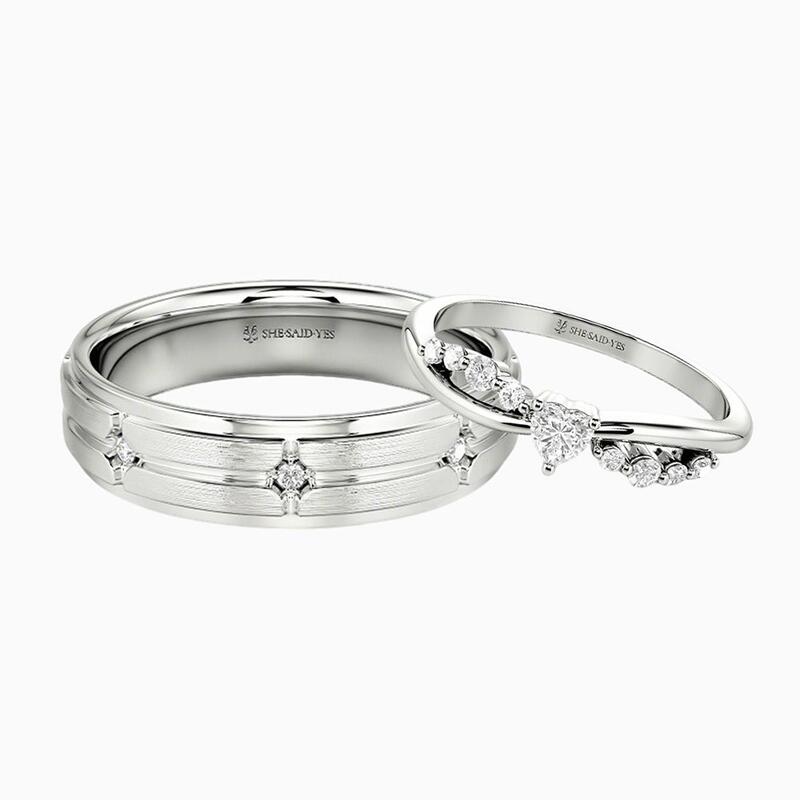Dieses bezaubernde Paarring-Set symbolisiert auf wunderschöne Weise die Verbindung zweier Herzen. Ihr Ring präsentiert einen bezaubernden herzförmigen Mittelstein in einem anmutigen Crossover-Design, während sein Ring eine maskuline Satinpolitur mit stufenförmigen Kanten aufweist. Beide Ringe sind mit funkelnden Edelsteinen besetzt – ihre in einer zarten Shared-Prong-Fassung, seine in einem auffälligen Rillengittermuster. Dieses harmonische Paar verkörpert die perfekte Balance aus Eleganz und Stärke in der Liebe.