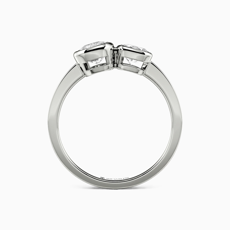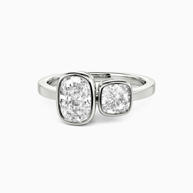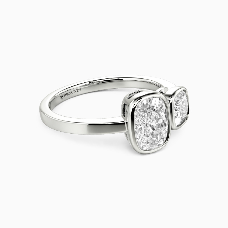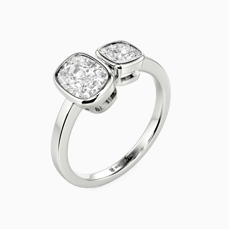 Dieser Toi et Moi Ring, der die Essenz von "du und ich" einfängt, verflechtet zwei Seelen in einer zeitlosen Umarmung. Der serene Kissenssschliff, neben seinem eleganten länglichen Gegenstück in schlanken Zargenfassungen gebettet, symbolisiert eine Liebe, die sowohl tröstend als auch stetig wachsend ist. Das polierte gerade Band steht für einen standhaften Weg nach vorn und macht diesen Ring zu einem tiefgründigen Versprechen gemeinsamer Morgen.