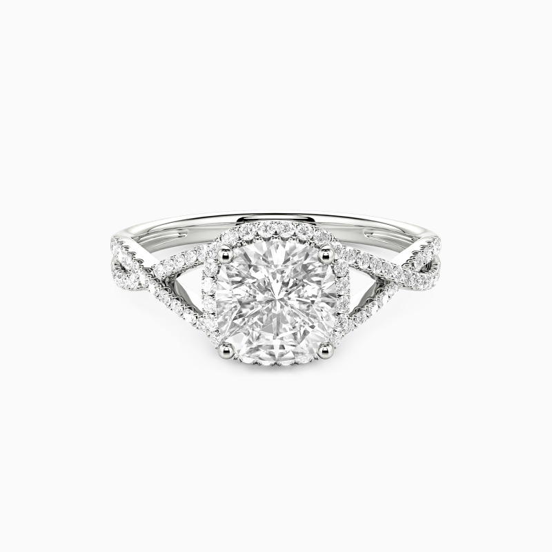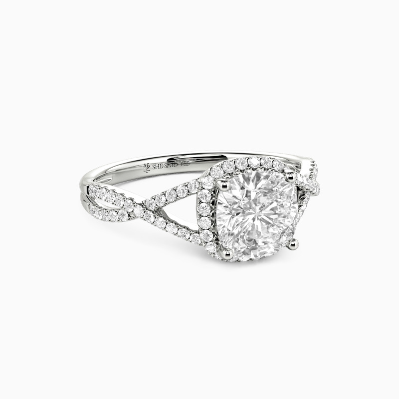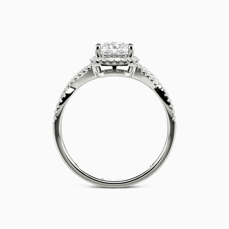 Zwei Bänder überkreuzen sich nahe dem Mittelstein und verleihen dem gesamten Ring ein einzigartiges Aussehen. Die beiden Reihen von Akzentsteinen sind miteinander verschlungen und bilden einen Halo, der die Brillanz maximiert. Fragen Sie sie mit diesem Ring, und sie wird diesen ewigen Moment für immer in Erinnerung behalten.